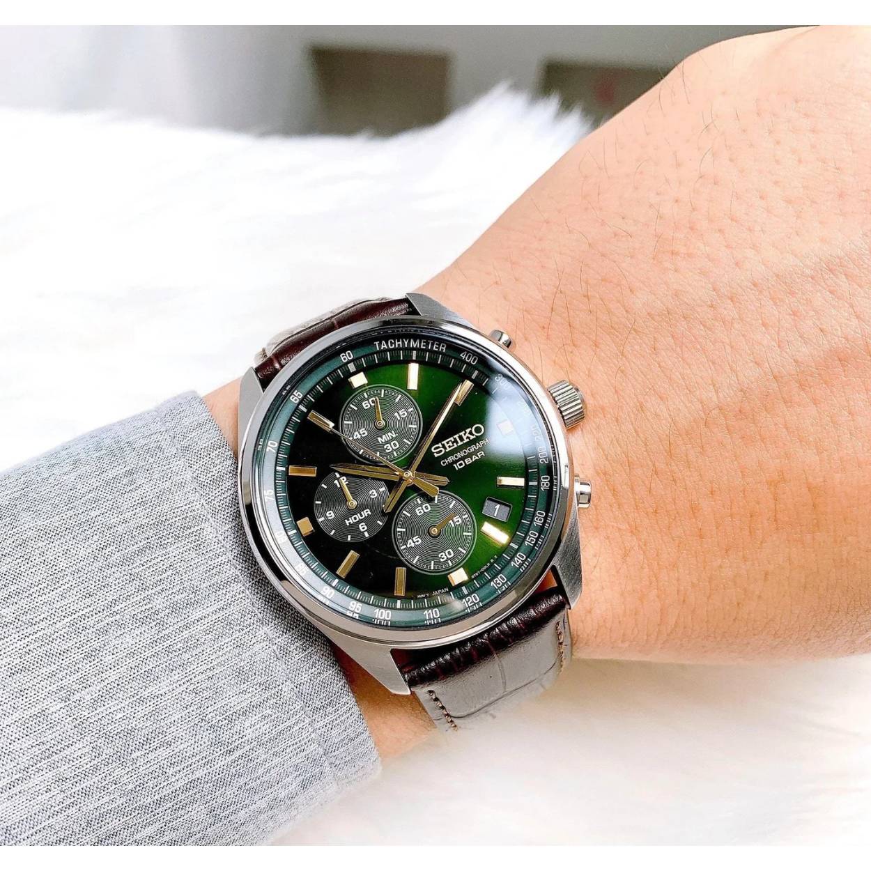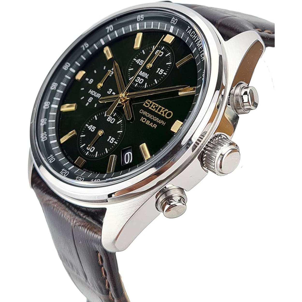 Dit herenhorloge is van het merk Seiko. Het is een chronograaf horloge gemaakt van staal. De diameter van de kast is 41.5 mm en de kast is 12 mm dik.