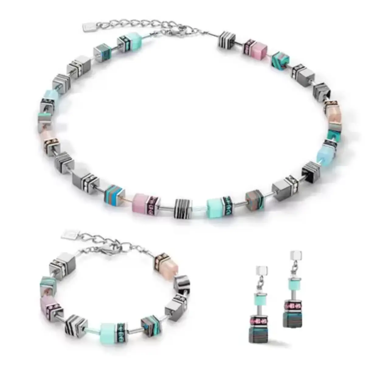 Blauw roze GeoCUBE oorstekers Candy aqua pink uit de collectie van Coeur de Lion, nieuw in geschenkverpakking. De roestvrijstalen oorbellen zijn handgeregen in Duitsland, met synthetisch malachiet, synthetisch tijgeroog, strass rondellen en roestvrij staal. Lengte van de oorbellen is 3,1 cm, dikte van het blokje is 0,6 cm.