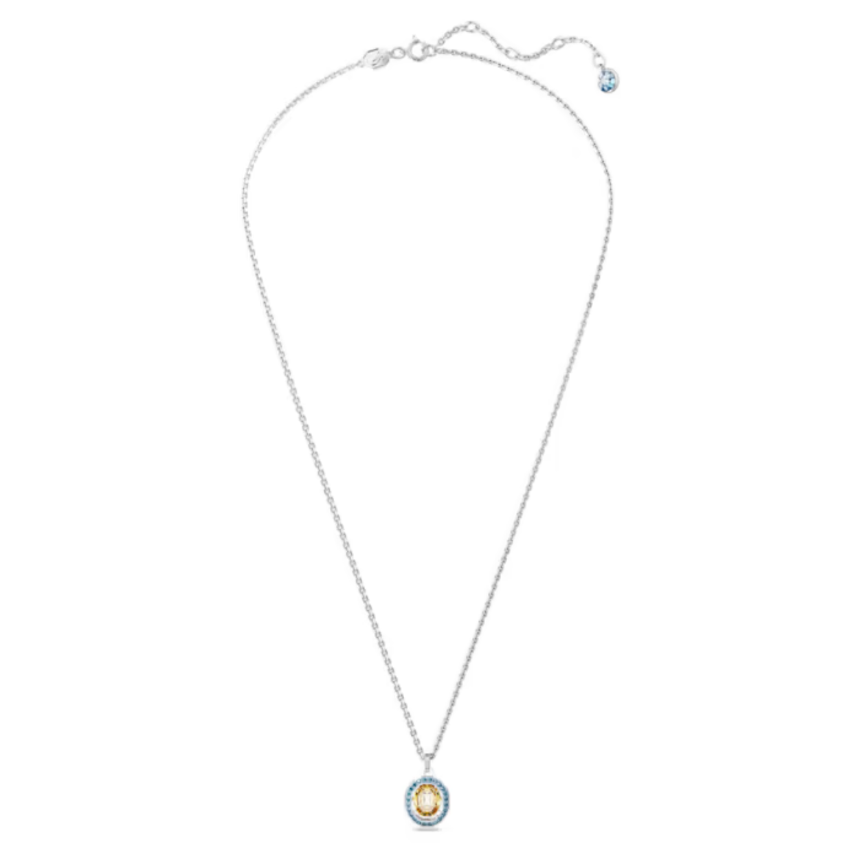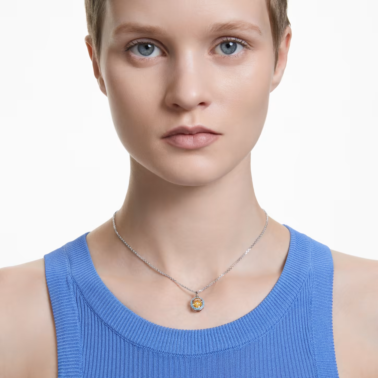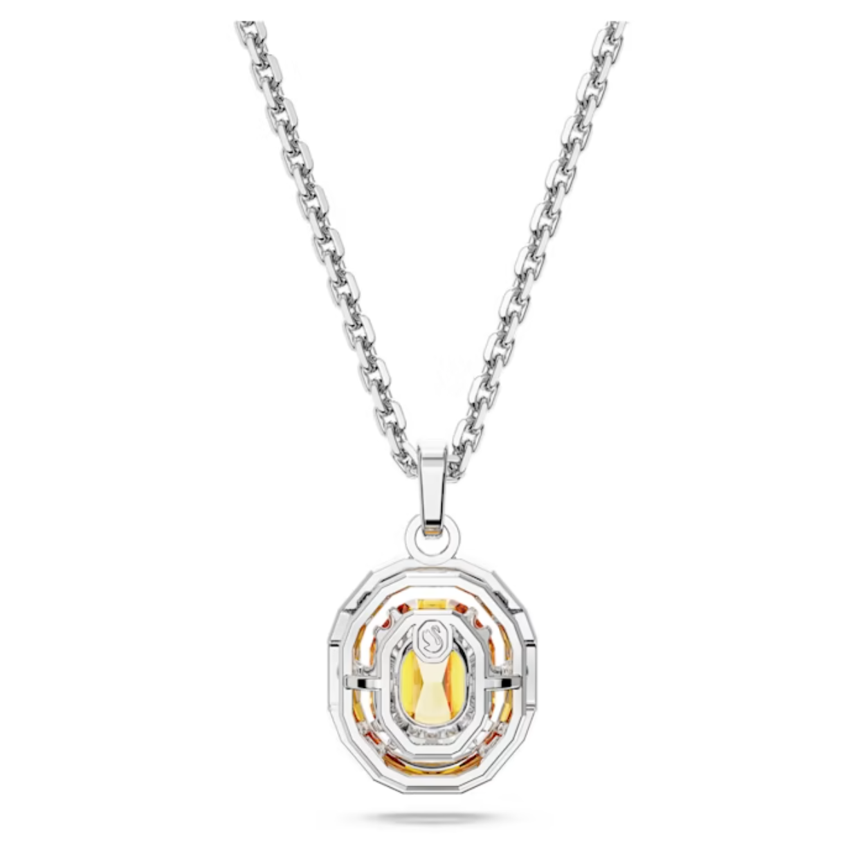 Deze vrolijke hanger is een perfect voorbeeld van de dynamische en edelsteenachtige Chroma-collectie. Het ontwerp met rhodium toplaag bevat een achthoekige Dancing Stone in een gele kleur, die prachtig is voorzien van facetten en omringd wordt door kleine blauwe kristallen. De hanger hangt aan een ketting en is ontworpen om uw outfit voor overdag of 's avonds tot de verbeelding te laten spreken.