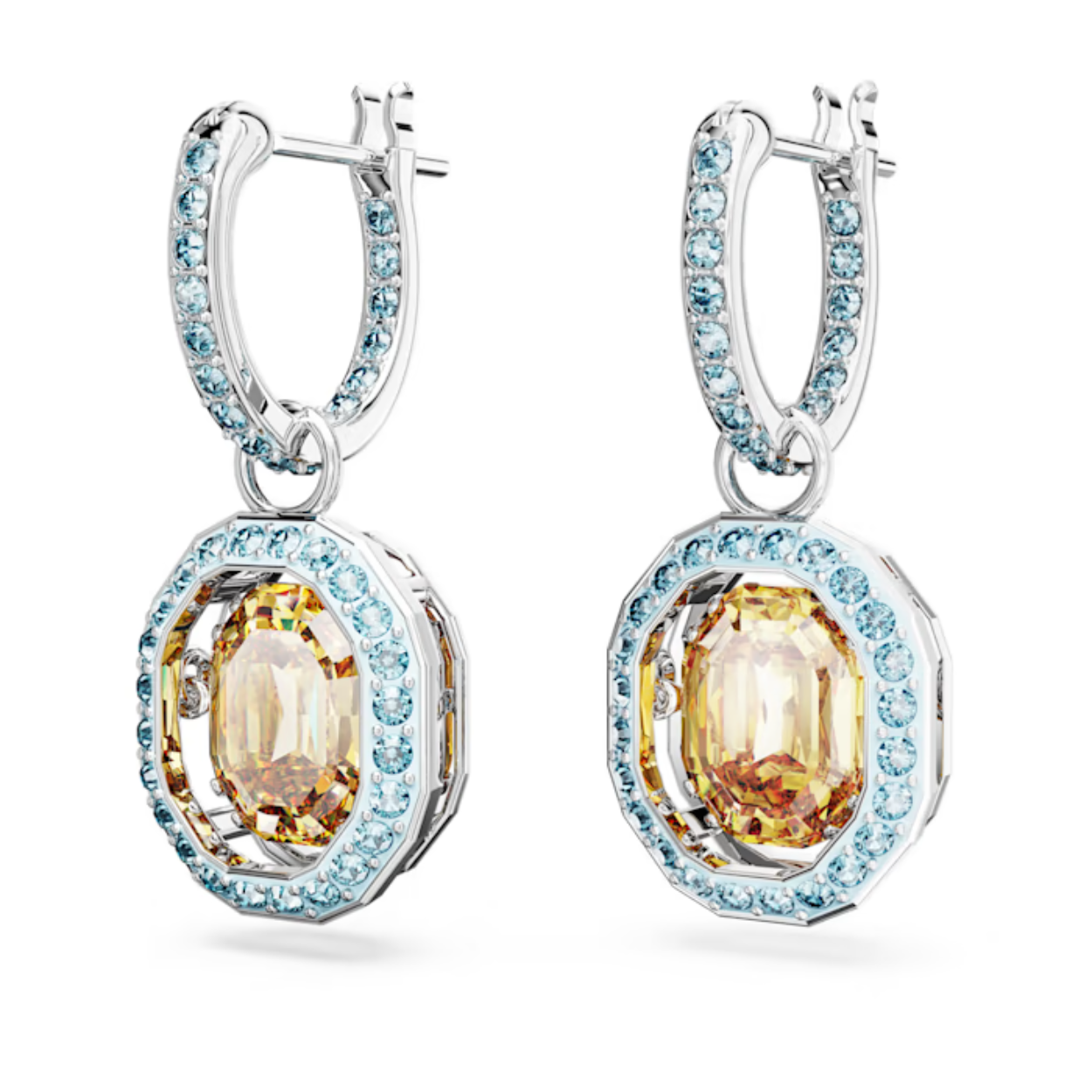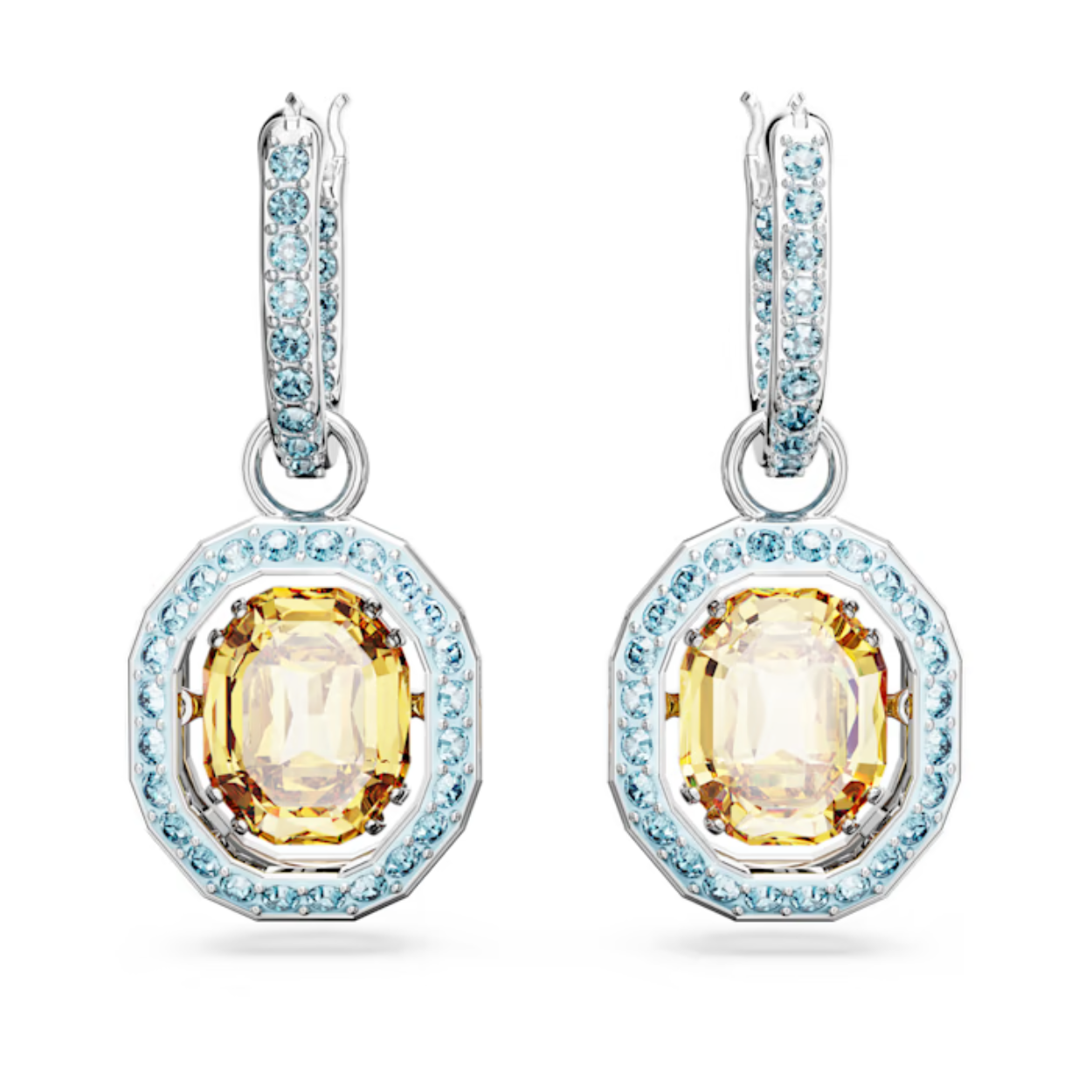 Deze schitterende oorbellen breken het licht vanuit elke hoek en geven het krachtige karakter van de Chroma-lijn perfect weer. Het ontwerp met rhodium toplaag bevat een achthoekige Dancing Stone in een gele kleur, die prachtig is voorzien van facetten, omringd wordt door kleine blauwe kristallen en aan een ring met pavé hangt. Met deze oorbellen steelt u gegarandeerd de show.