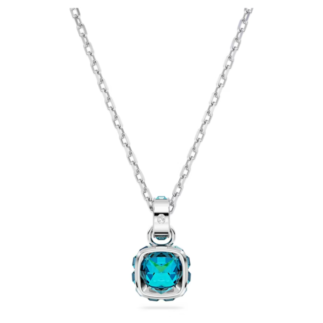 Deze verfijnde hanger is geïnspireerd op de geboortesteen van december. Het sieraad met rhodium toplaag hangt aan een fijne ketting met een schitterende schakel van kristallen en is voorzien van één steen met vierkant-slijpvorm in een turquoise kleur, een betoverende tint die staat voor geluk en succes. Dit betekenisvolle ontwerp is een magisch verjaardagscadeau of kan gedragen worden om een speciale gelegenheid te vieren.