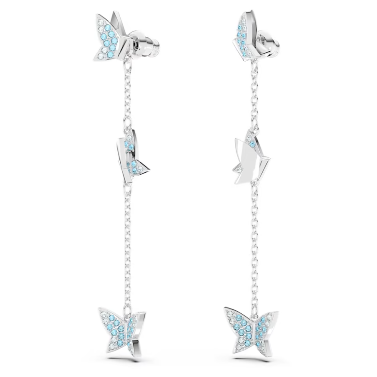 Deze op de natuur geïnspireerde oorbellen bevatten speelse vlinders in beweging. De vlinders hangen aan kettingen met rhodium toplaag en breken het licht vanuit elke hoek door het schitterende blauwe kristalpavé. Dit veelzijdige sieraad kan ook gedragen worden als oorknopje door de hanger los te maken. De keuze is aan u.