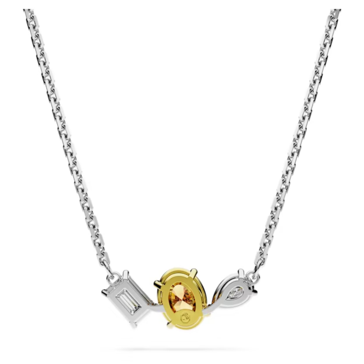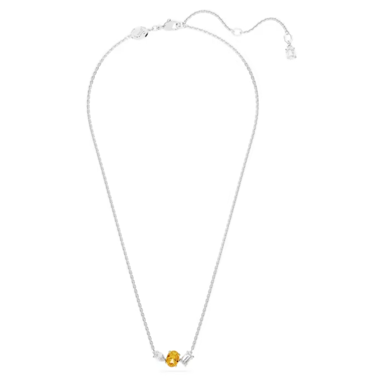 Deze elegante Mesmera-hanger zorgt voor een stijlvol accent door de opvallende combinatie van slijpvormen en kleuren. Het ontwerp met een rhodium toplaag hangt aan een fijne ketting en bevat een drietal Swarovski Zirkonia met verschillende vormen in klauwzettingen en een felgele steen in het midden die is afgewerkt met een zetting met een goudkleurige toplaag. Een prachtig cadeau dat elke stijl accentueert. Lengte 38 - 45 cm