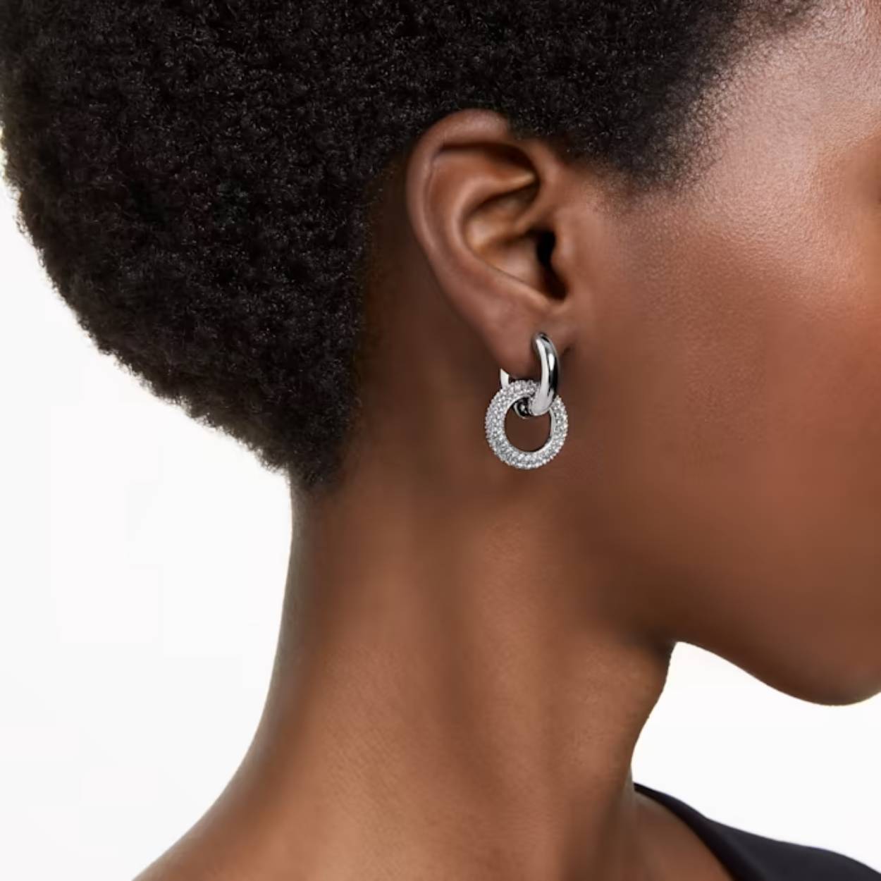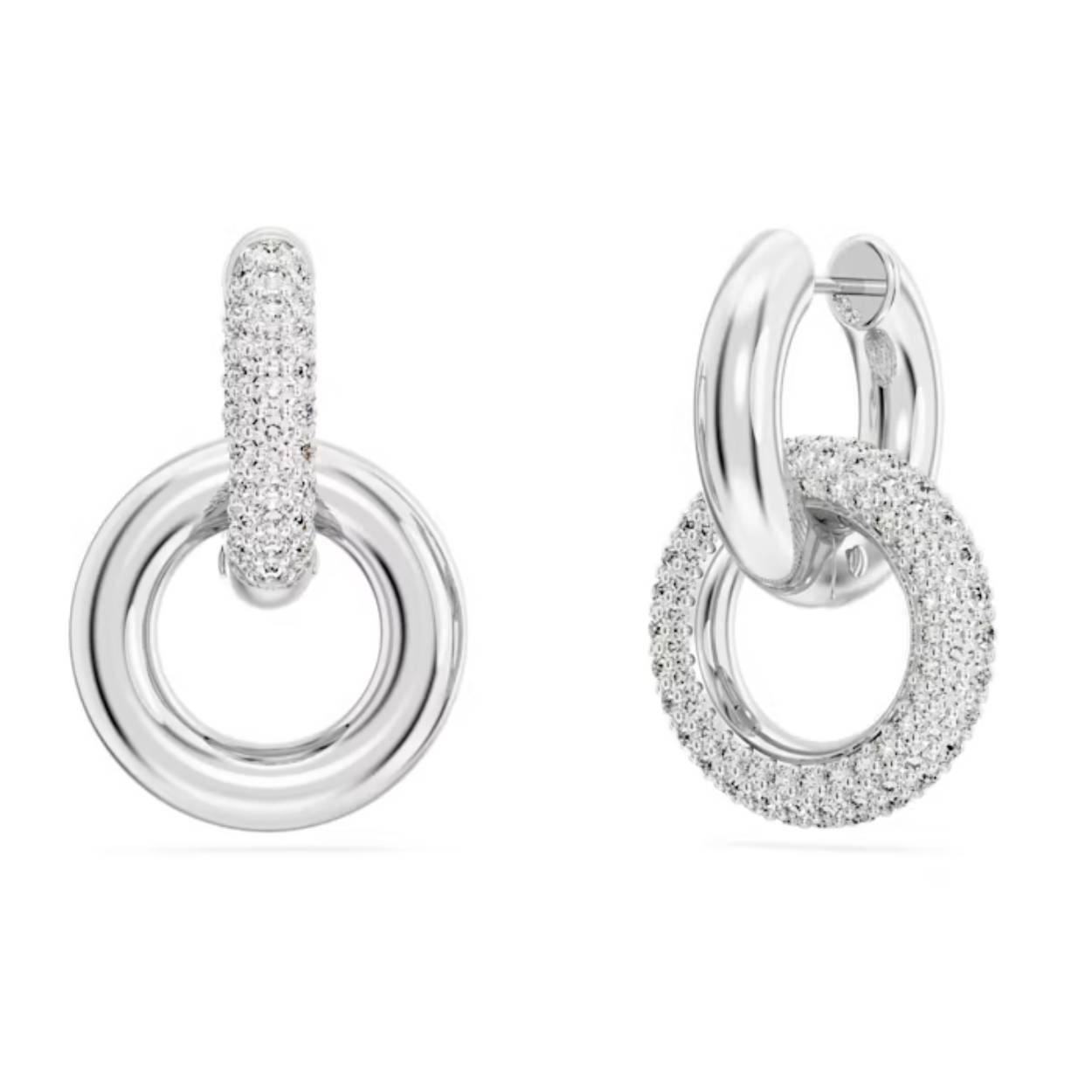 Deze in elkaar hakende Dextera-oorringen bevatten twee tubulaire ringen met een rhodium toplaag, waarvan een ring die volledig is voorzien van kristalpavé. De ringen zijn op verschillende plekken op elk sieraad bevestigd voor een asymmetrische look en de tweede ring kan losgemaakt worden zodat er slechts één ring gedragen wordt.