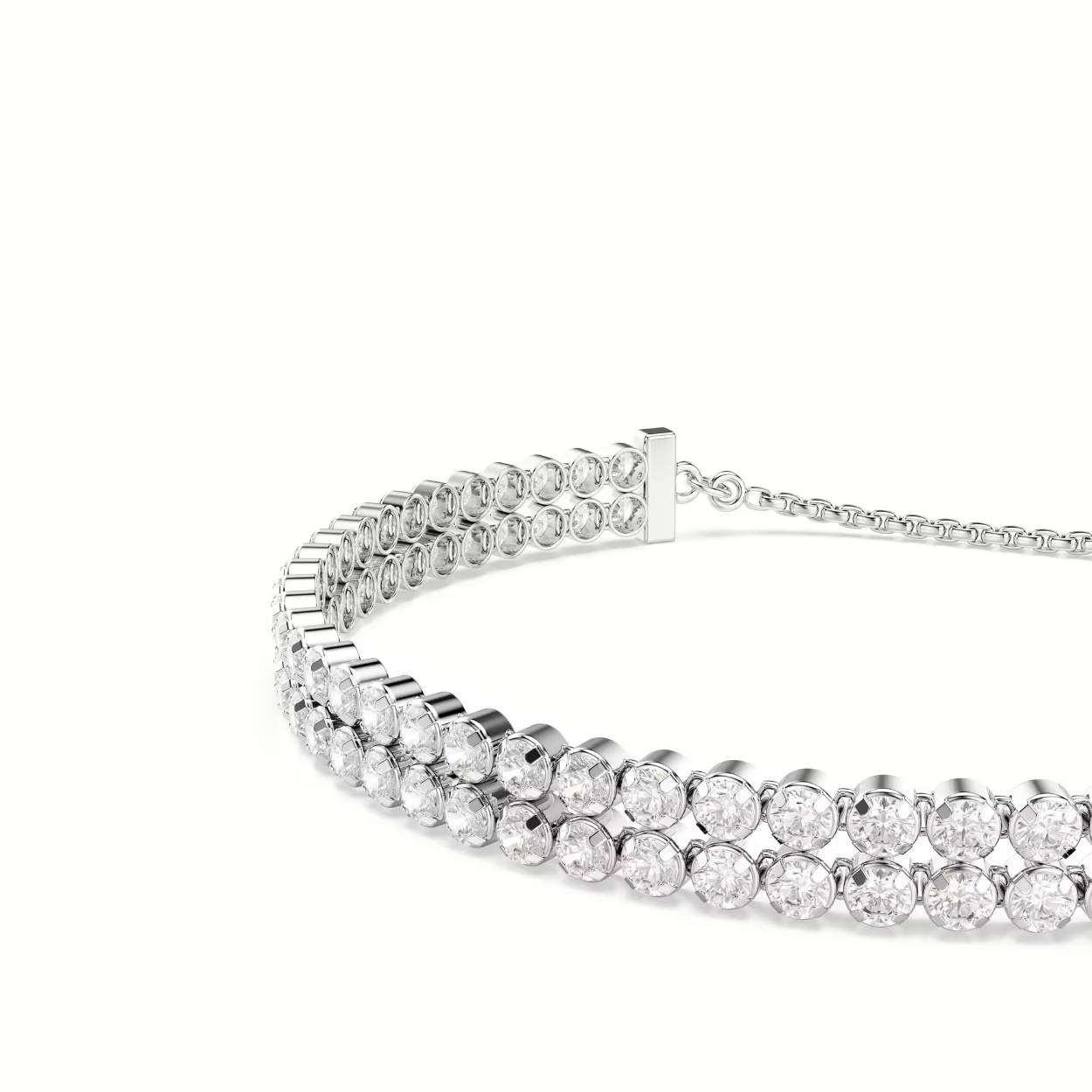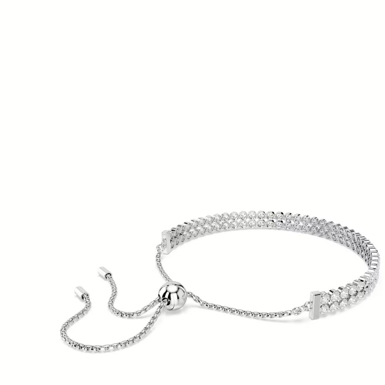 Deze tijdloze armband met rhodium toplaag is een ideaal cadeau voor liefhebbers van licht. Twee delicate strengen Swarovski Zirkonia zijn gezet in een elegant cupchain-ontwerp, dat prachtig rond de pols valt. De armband is afgewerkt met een innovatieve glijdende kogelsluiting, waarmee u de maat kunt aanpassen voor een perfecte pasvorm. Draag deze armband voor een verfijnde look overdag of creëer een glamourvolle look voor de avond door hem te combineren met contrasterende stijlen.