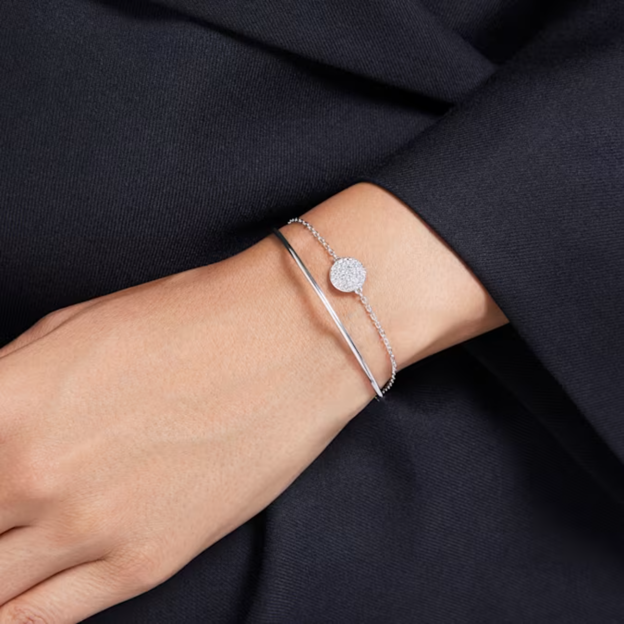 Deze schitterende armband is een eerbetoon aan de kosmos en brengt de drager eindeloze vreugde. Om de pols bestaat het ontwerp met rhodium toplaag uit een harde band gecombineerd met een delicate ketting met een bolvormig meteoormotief. Dit is voorzien met een sneeuwpavé van heldere rondgeslepen kristallen in verschillende formaten. Draag deze armband met een bijpassende armband om elke outfit een stralend accent te geven.