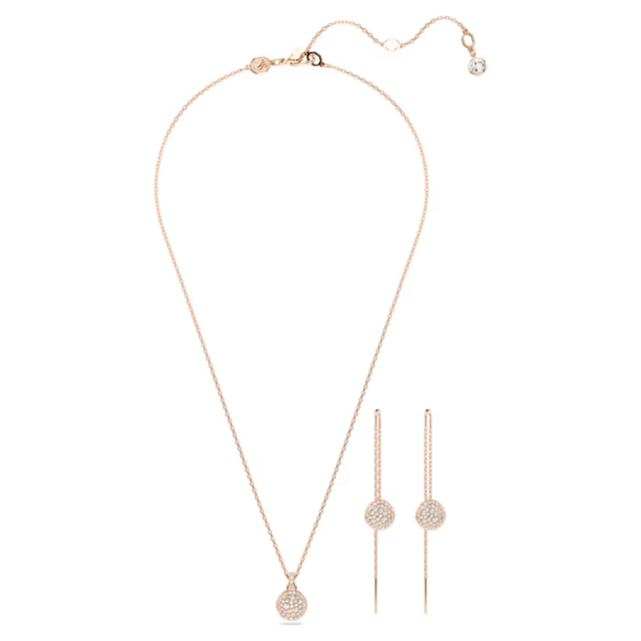 Deze sieradenset met roségoudkleurige toplaag combineert de inspiratie van sterren met de savoir-faire van Swarovski. De stralende hanger wordt gedragen aan een delicate ketting met karabijnsluiting en is voorzien van een bolvormig meteoormotief met een sneeuwpavé van heldere rondgeslepen kristallen in verschillende formaten. De oorstekers hebben hetzelfde prachtige motief in een hangend ontwerp met dubbele ketting. Een bijzonder cadeau voor een geliefde of een prachtige aanvulling op uw eigen stijl.