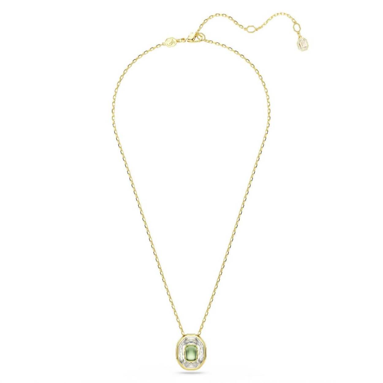 Deze expressieve Chroma-hanger straalt creativiteit uit. De hanger met goudkleurige toplaag hangt aan een delicate ketting en heeft een centraal, achthoekig motief met een levendig groen kristal bovenop een groter helder kristal. Dit is een tijdloos stuk dat energieke originaliteit zal toevoegen aan elke outfit.