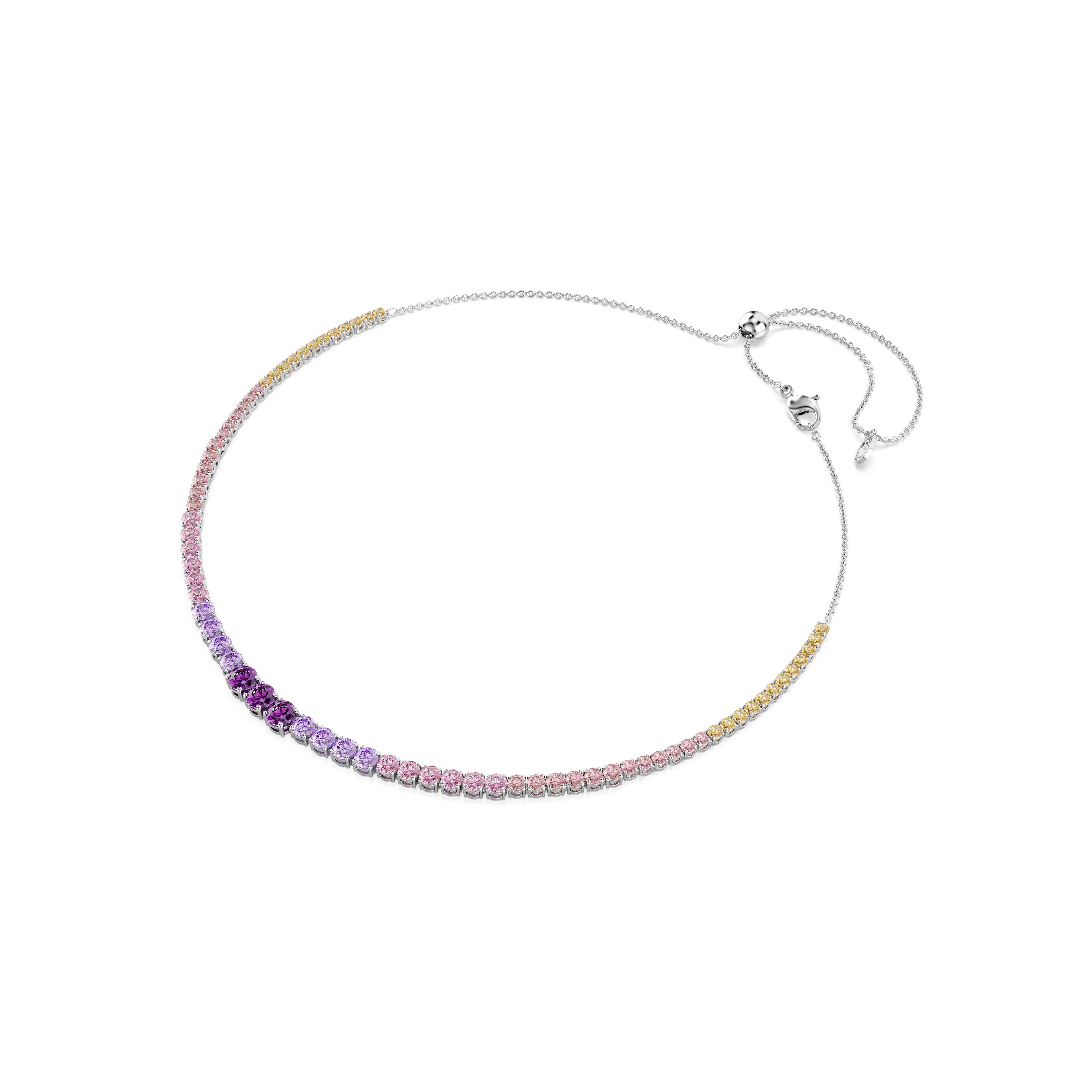 Deze ketting met rhodium toplaag geeft een nieuwe dimensie aan de iconische Matrix-ketting met een dynamisch verloop van pastelkleuren en formaten. De glanzende rij kristallen in Round-slijpvorm verloopt van roze naar paarse en gele tinten, wat een fascinerend effect creëert. Deze ketting is verstelbaar voor een persoonlijke pasvorm en kan worden gecombineerd met de bijpassende oorbellen of armband om de look te maximaliseren.