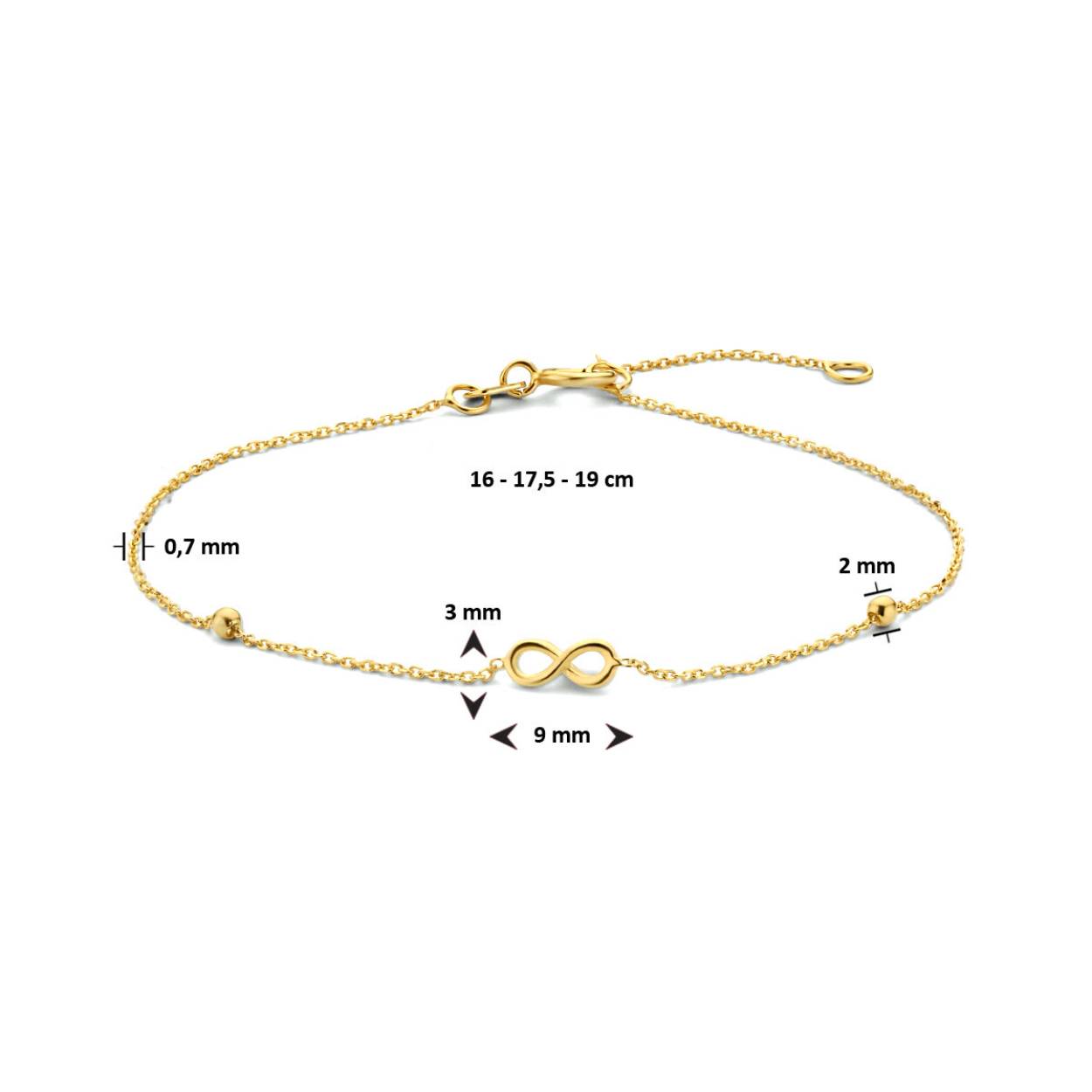 14k Geelgouden armband met een infinity hanger en bolletjes. De armband heeft draaglengtes van 16, 17,5 en 19cm. De schakelbreedte is 0.7mm.