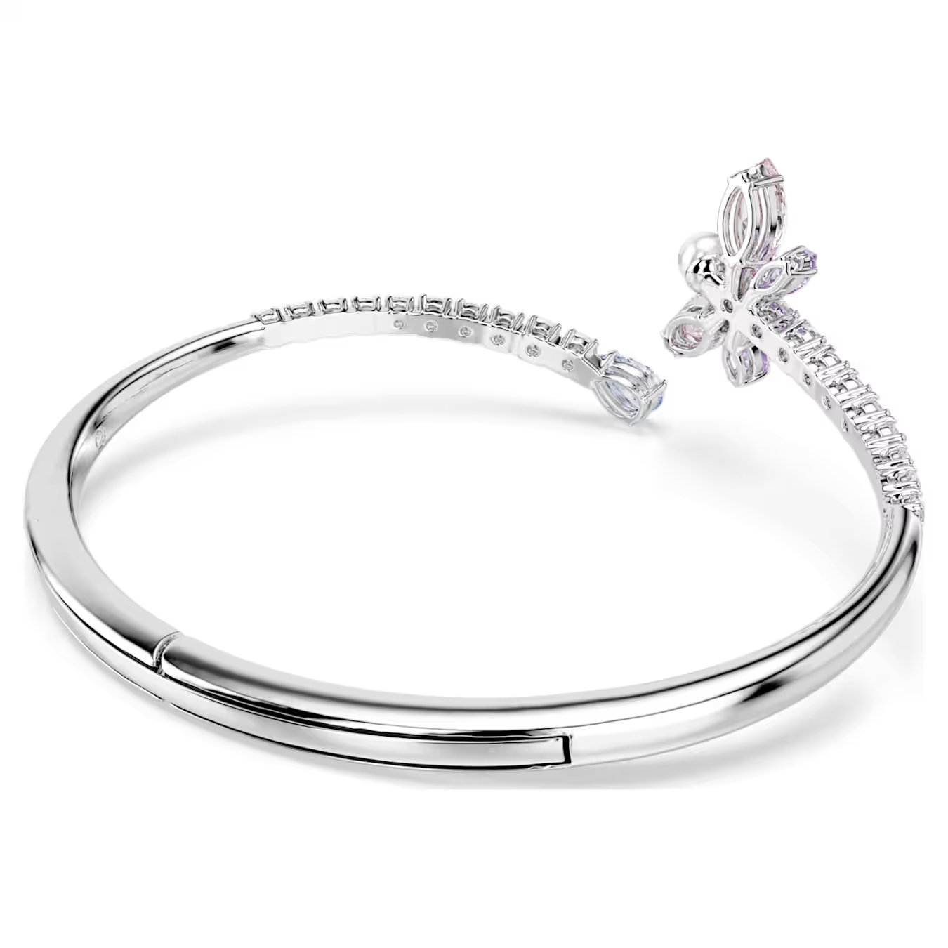 Kleur ontmoet magie in deze op de natuur geïnspireerde armband. De open band is bezet met heldere Swarovski Zirkonia en heeft aan het ene uiteinde een blauwe Swarovski Zirkonia in Pear-slijpvorm en aan het andere uiteinde een libellemotief, gevormd met roze en paarse vleugels en een enkele Swarovski Crystal Pearl. Deze kleurrijke armband is vervaardigd met rhodium toplaag en heeft een scharniersluiting. Hij kan worden gedragen in combinatie met andere bijpassende stukken uit dezelfde libelle-lijn.