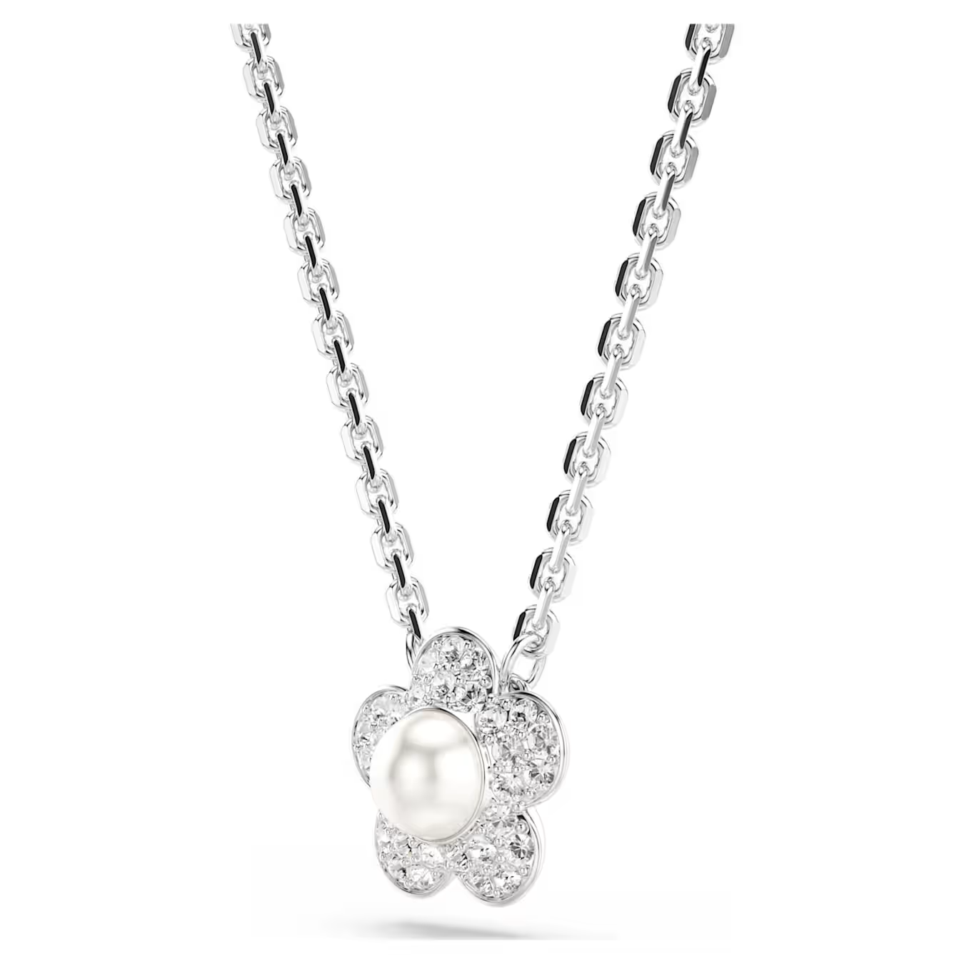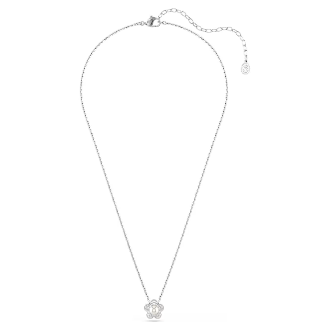 Als een subtiel eerbetoon aan de natuur toont deze hanger met rhodium toplaag een delicate bloem met kristallen hart en blaadjes versierd met glinsterende pavé. Draag het samen met de bijpassende oorknoppen om elke look een stralende toets van ingetogen luxe te geven.