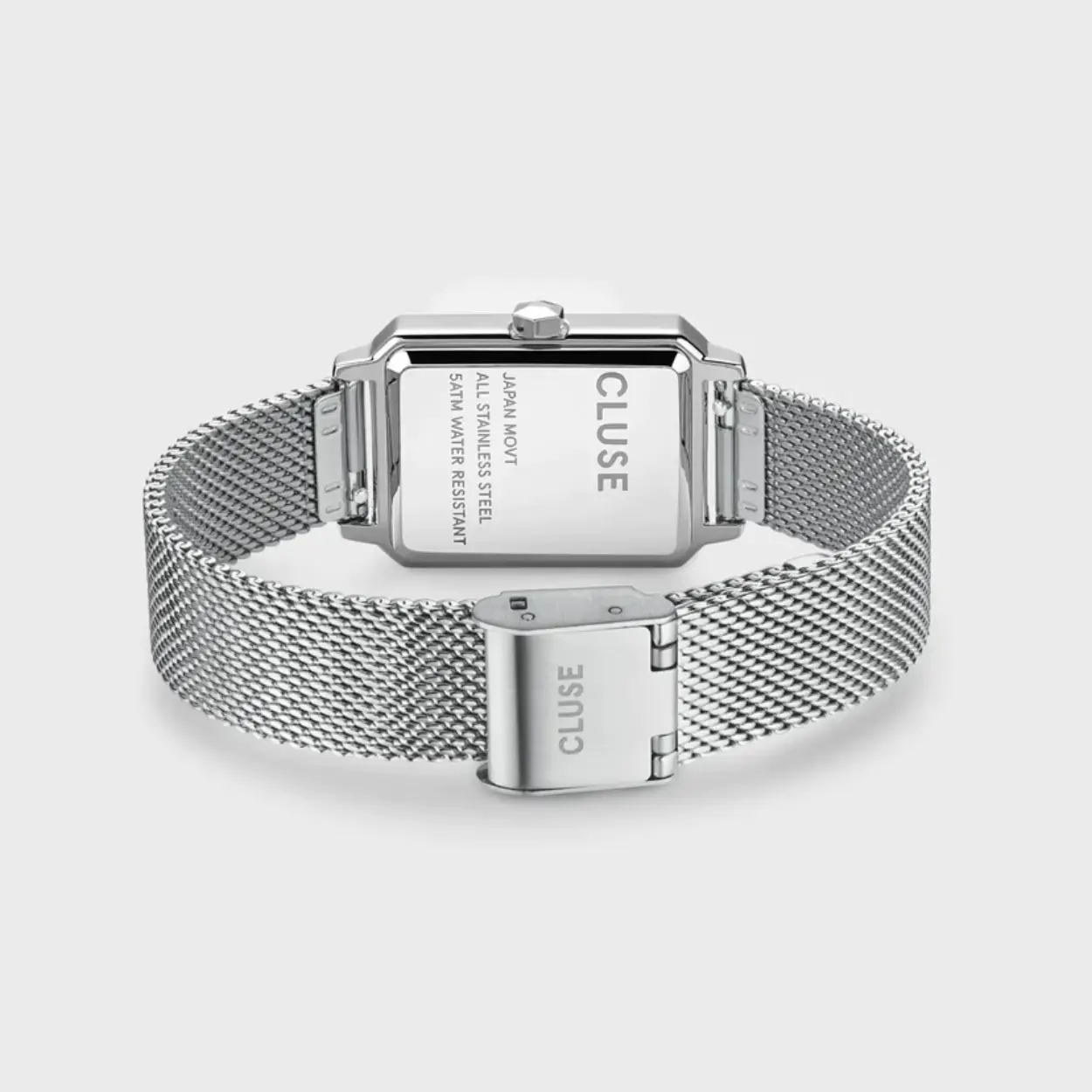 Schitter het hele jaar door met het CLUSE Fluette dameshorloge. We hebben onze kenmerkende Fluette opgeleukt met een mesh horlogeband voor een tijdloos ontwerp. Met een gepolijste zilverkleurige rechthoekige horlogekast van 30,6 mm, een witte wijzerplaat en een zilverkleurige mesh horlogeband van 14 mm. Met zijn unieke rechthoekige vorm en minimalistische flair hebben we deze blikvanger zorgvuldig ontworpen met een belangrijk doel voor ogen: een verfijnd horloge creëren met een sterke uitstraling. De maat van de horlogeband pas je makkelijk zelf aan.
