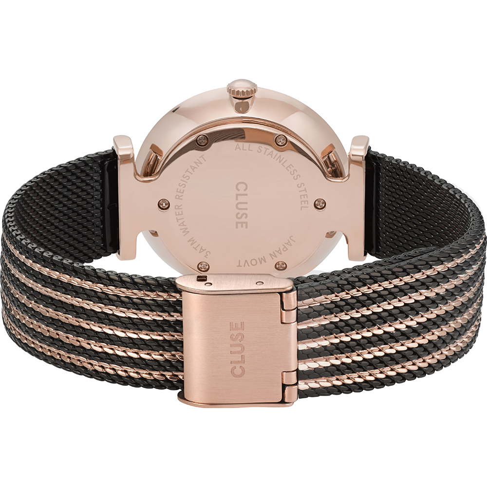 Ingetogen elegantie met contrasterende elementen die uitnodigen om naar hartenlust te mixen en matchen. Het mesh bandje met roségoudkleurige en zwarte strepen laat elegante eenvoud en glamoureuze glans samenkomen. De T-vormige bandaanzet zorgt voor een sierlijk silhouet. De wijzerplaat heeft een zachte metallic glans die het licht vangt en de aandacht trekt.