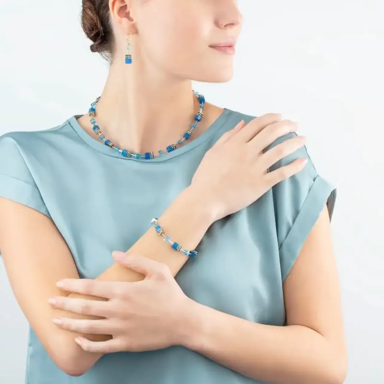 Fris en elegant collier met turkoois blauwe kubussen uit de GeoCUBE collectie van COEUR de LION. Het vergulde roestvrijstalen collier is geregen met schitterende kristallen, synthetisch tijgeroog, strass rondellen, gecombineerd met verguld roestvrijstaal. Lengte van het collier is 42 cm tot en met 48 cm, dikte van de blokjes is 0,6 cm.