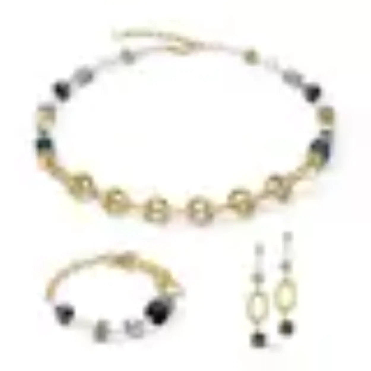 De ketting is gemaakt van verguld roestvrij staal, geregen met onyx, hematiet, Swarovski kristallen, kristalparels van Swarovski en strass rondellen. Draaglengte van het collier is 42 cm tot en met 48 cm, dankzij het handige verlengkettinkje. Dikte is 0,8 cm. De sluiting is ook van verguld roestvrij staal.