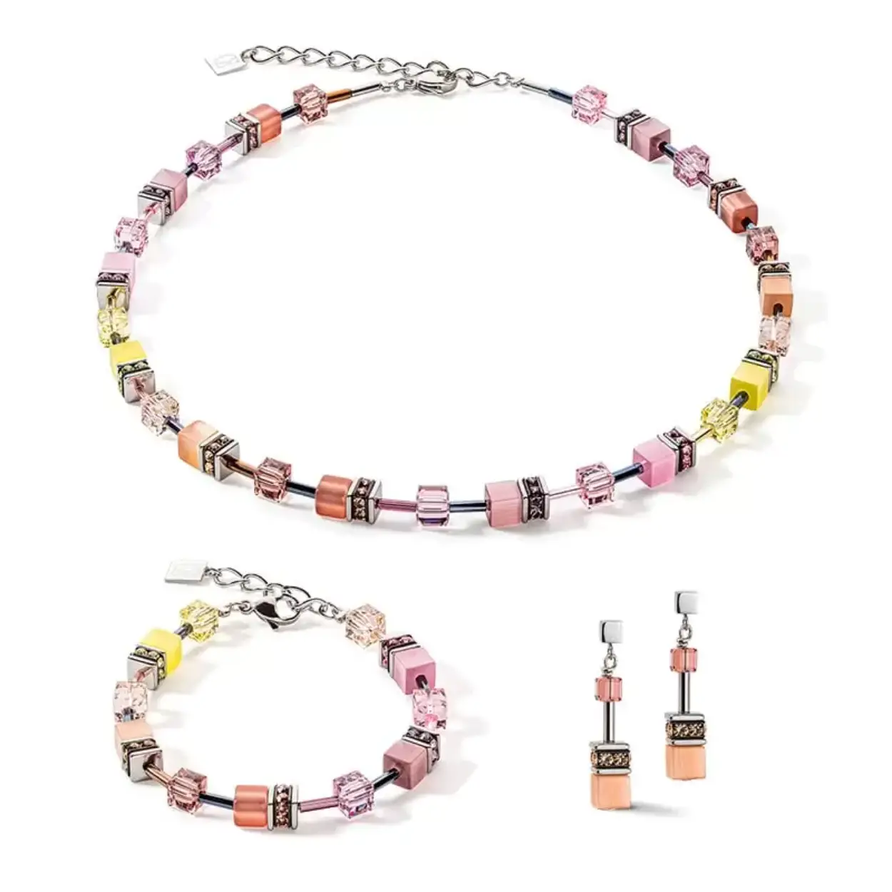 Zomerse versie van de bekende GeoCUBE oorbellen in fel lila en geel, handgemaakt in Duitsland door Coeur de Lion.