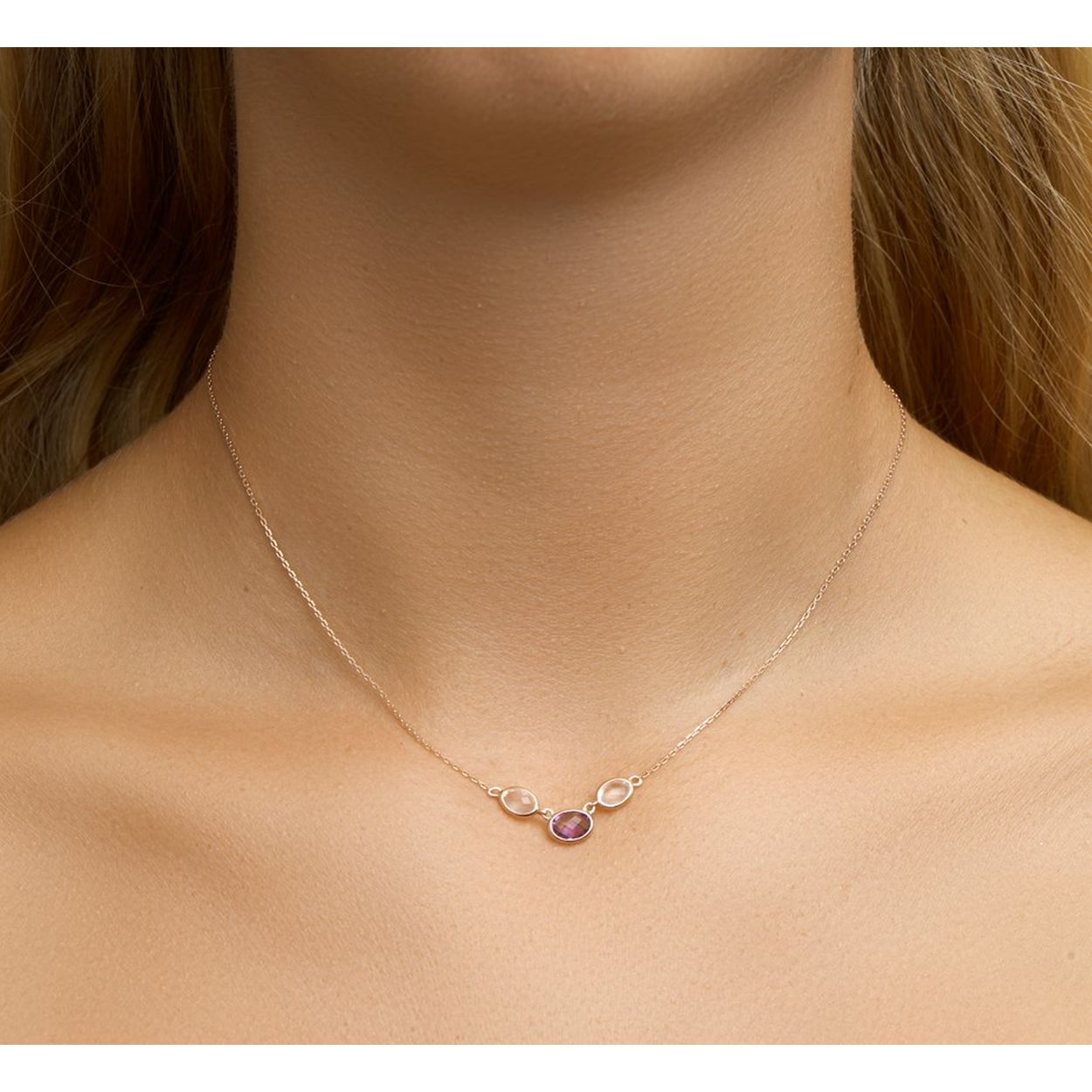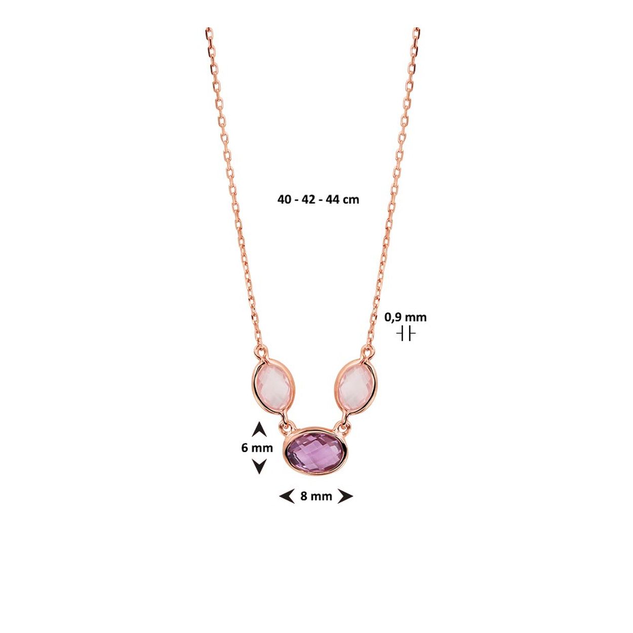 Rosegoud op 925 zilveren anker collier uitgevoerd met amethist en roze kwarts stenen. Het collier heeft een karabijn sluiting en draaglengtes van 40, 42 en 44cm. De schakelbreedte is 0.9mm. Geen garantie op plating.
