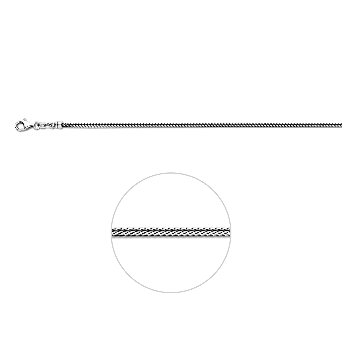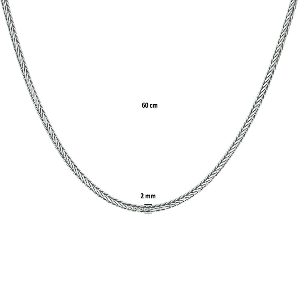 Geoxideerd zilveren collier met een vossestaart schakel en een stevige karabijn sluiting. Het collier heeft een draaglengte van 50cm. De schakelbreedte is 2.0mm.