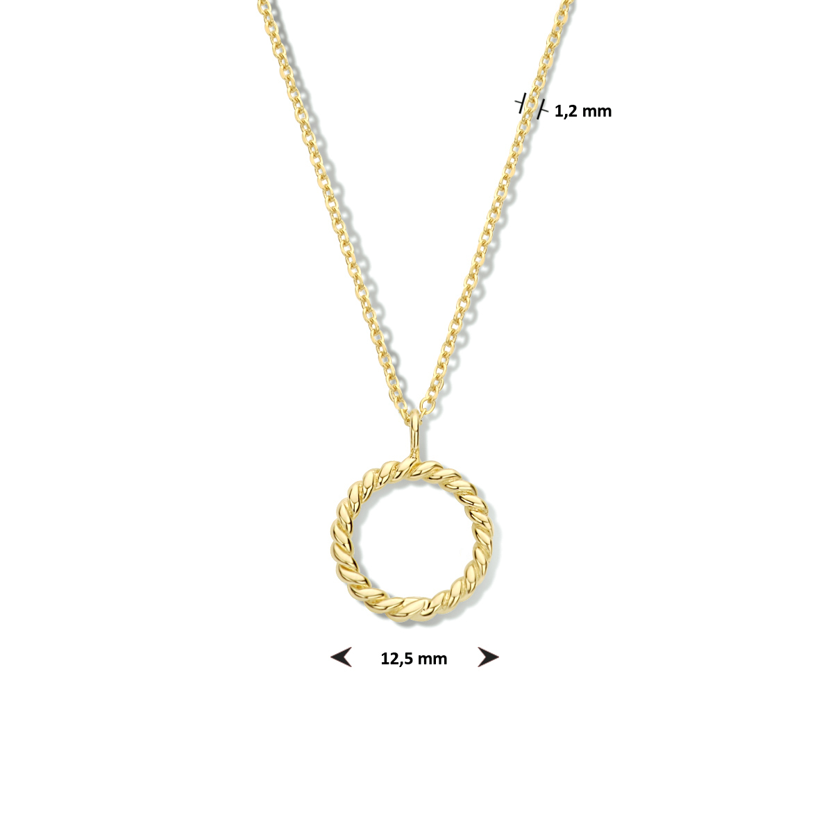 Geelgoud op 925 zilveren collier uitgevoerd met een ronde hanger. Het collier heeft een draaglengte van 41cm met een extensie van 4cm en een stevige karabijn sluiting. De hanger heeft een diameter van 12.5mm. De schakelbreedte is 1.2mm. Geen garantie op plating.
