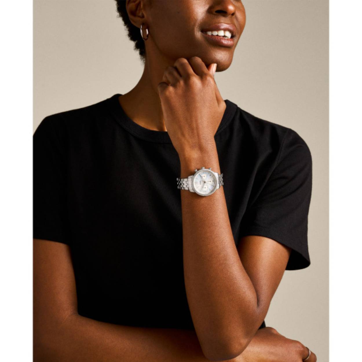 Dit mooie Fossil Neutra horloge van 36 mm heeft een witte parelmoeren wijzerplaat, een chronograaf uurwerk en een roestvrijstalen armband.