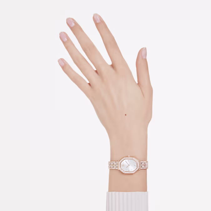 Geïnspireerd door de tijdloze elegantie van de Dextera-lijn is dit 18 x 23 mm horloge op unieke wijze vervaardigd in de iconische achthoekige vorm van Swarovski. Het ontwerp is gemaakt van edelstaal met een roségoudkleurige afwerking en heeft een pavé lunettezetting met 46 kristallen, en een extra kristal gezet in de kroon. De zonnewijzerplaat bevat ook delicate kristallen uuraanduidingen, samen met slanke wijzers en een zwanenlogo op 12 uur. Om deze stralende creatie te completeren, is de armband met vijf schakels versierd met 108 rondgeslepen kristallen, waardoor u elk uur eindeloos schittert. Dit Swiss Made horloge is waterbestendig tot 50 meter.