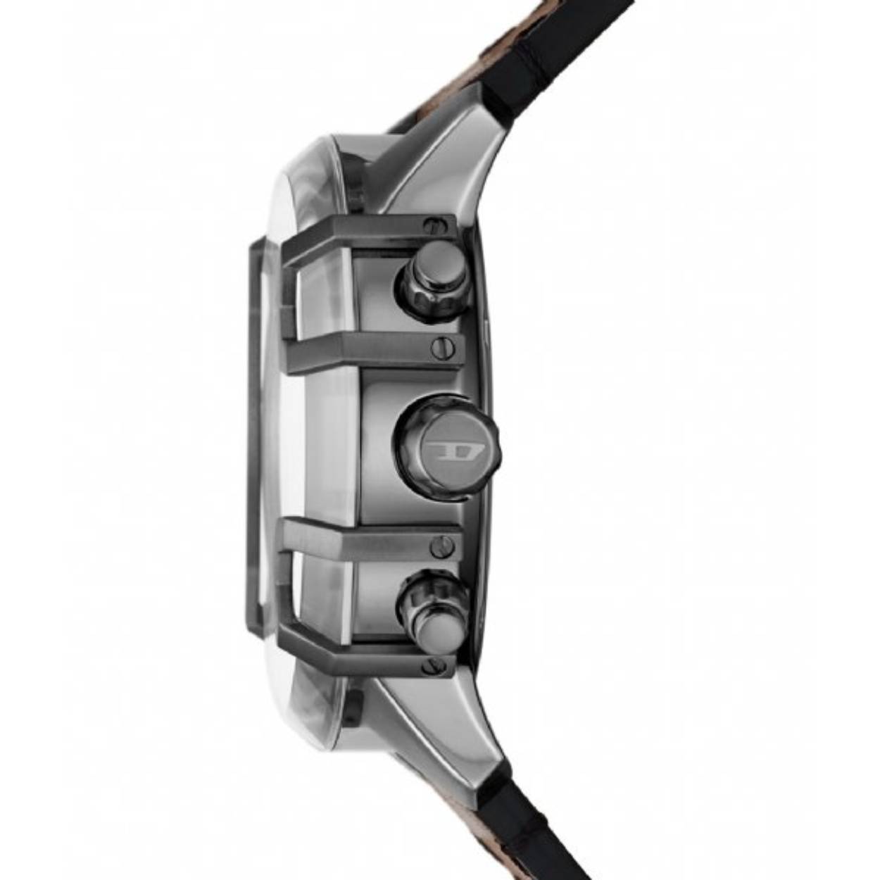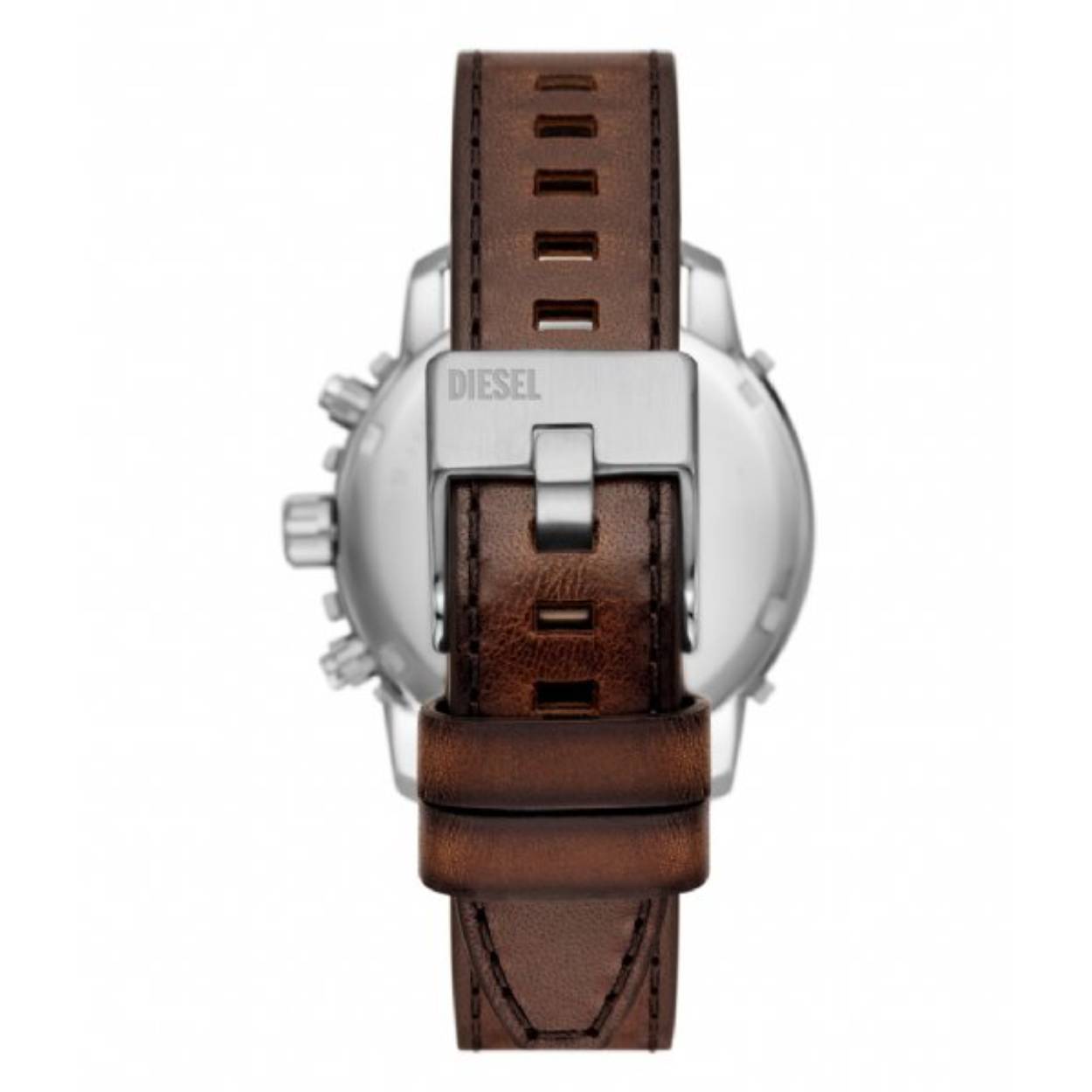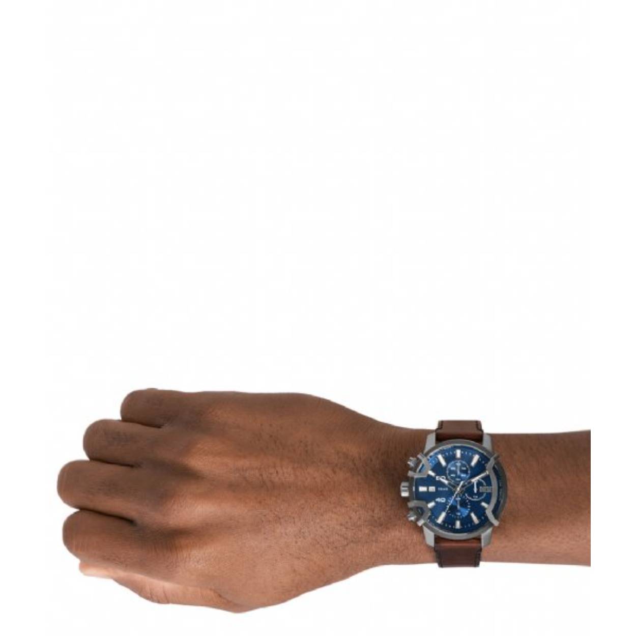 Dit Diesel downsized Griffed horloge van 42mm heeft een blauwe sunray-wijzerplaat, een chronograaf uurwerk en een bruin leren bandje met leer afkomstig van een LWG-gecertificeerde leerlooierij.