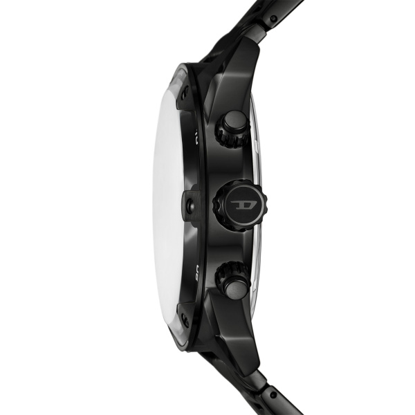 Het Spiked horloge van 48 mm van Diesel heeft een wijzerplaat met zonnestraaleffect met kleurverloop in zwart en bruin, een chronograaf uurwerk en een zwart roestvrijstalen horlogebandje.