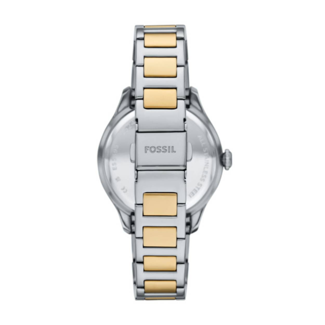 De Fossil horloge ES5396 is een elegante polshorloge met een roestvrijstalen kast en band in goud-zilver kleur. Het horloge heeft een zilverkleurige wijzerplaat met romeinse cijfers en een datumaanduiding. Het is waterbestendig tot 5 ATM en heeft een mineraal glas. Dit horloge past perfect bij formele en casual outfits. Draag het met vertrouwen, nikkelvrij en antiallergisch.