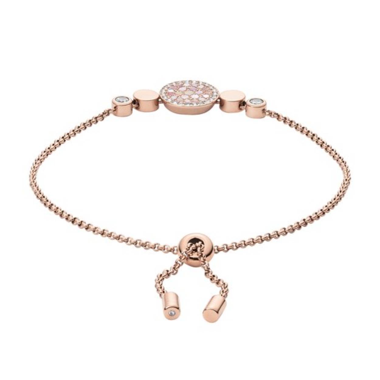 Deze schuifarmband heeft een schijf, parelmoeren- en glitteraccenten en is gemaakt van rosë-goudkleurig staal. Is op maat te schuiven.