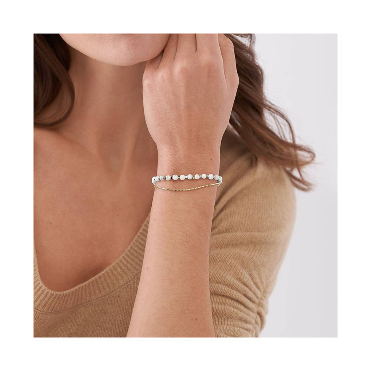 Stijlvol. Opvallend. Stapelbaar. Deze prachtige armband heeft echte howliet aan een gepolijste goudkleurige roestvrijstalen ketting met een karabijnsluiting.