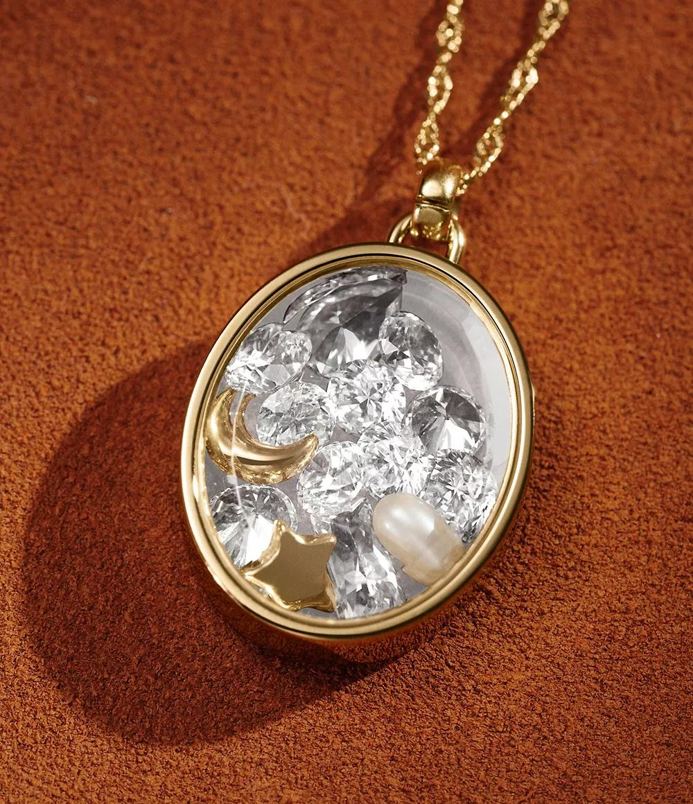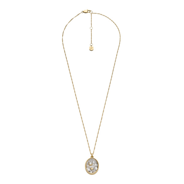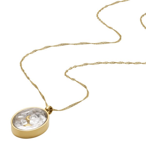 Deze hanger is voorzien van een speelse combinatie van zwevende bedels en steentjes die bij elke beweging het licht vangen. Gemaakt van gepolijst goudkleurig roestvrij staal met een fijne ketting met een karabijnsluiting voor verstelbaarheid. De zorgvuldig ontworpen combinatie van steentjes en beweging zorgt voor een subtiele visuele interesse, waardoor het een opvallend accessoire is.