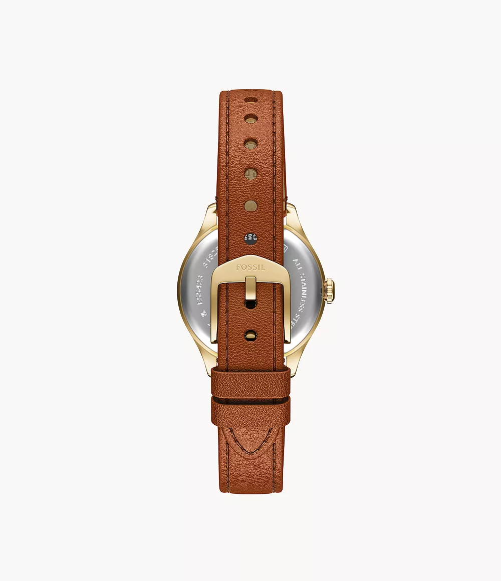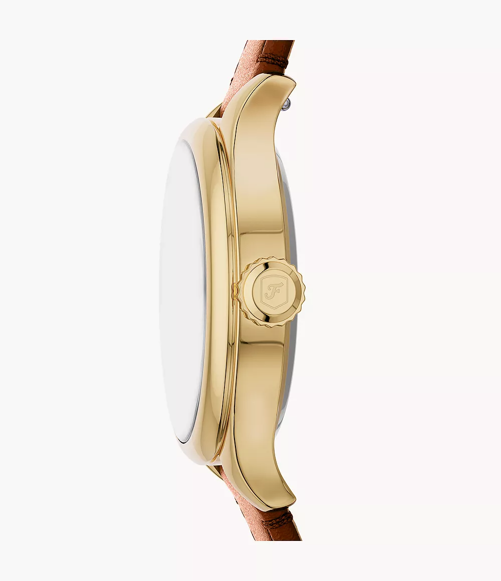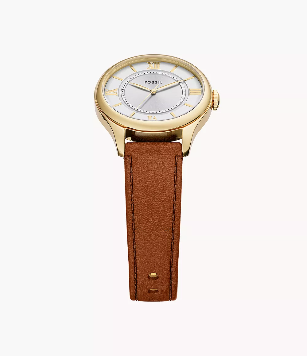 De goudkleurige roestvrijstalen kast die de zilverkleurige wijzerplaat met zonnestraaleffect omlijst, zorgt voor een verfijnd evenwicht. De bruine leren band voegt warmte toe en contrasteert subtiel met de gepolijste goudkleurige afwerking. Doordachte details, zoals een gebruiksvriendelijke indeling met drie wijzers, zorgen voor moeiteloze functionaliteit, terwijl de kleine, ronde kast de subtiele charme versterkt.