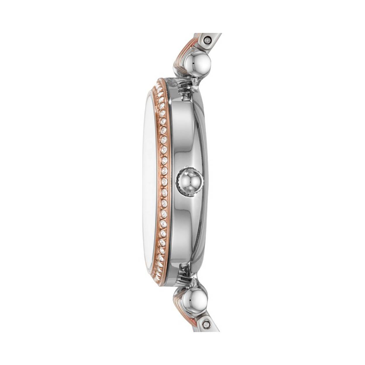 Dit dameshorloge is van het merk Fossil. Het is een  horloge met een band gemaakt van edelstaal. De diameter van de kast is 28 mm.