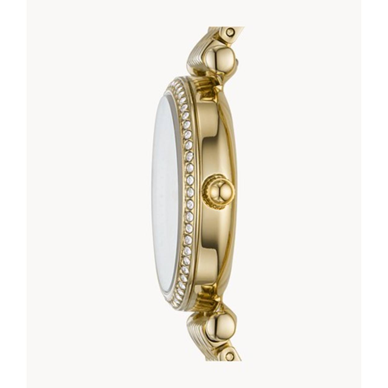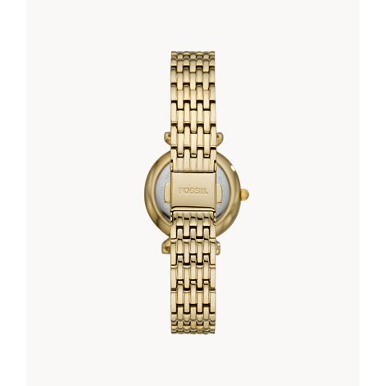 Dit dameshorloge is van het merk Fossil. Het is een  horloge met een band gemaakt van edelstaal. De diameter van de kast is 28 mm.
