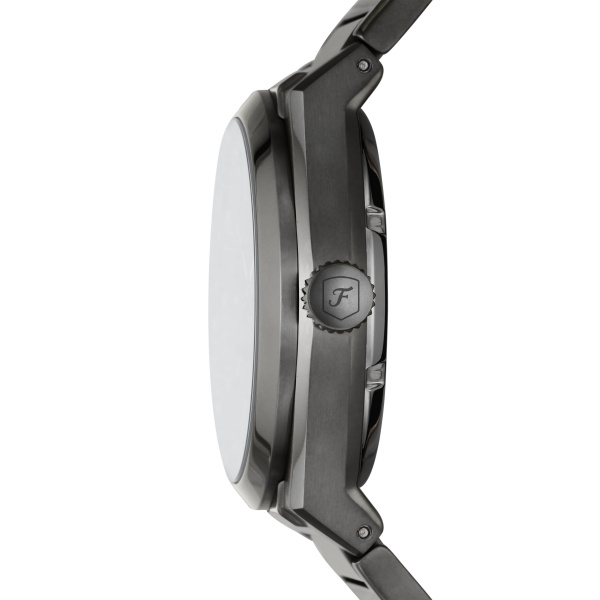 Deze Everett van 42 mm heeft een grijze matte getextureerde sunray-wijzerplaat, een automatsich uurwerk en een smoke roestvrijstalen armband.