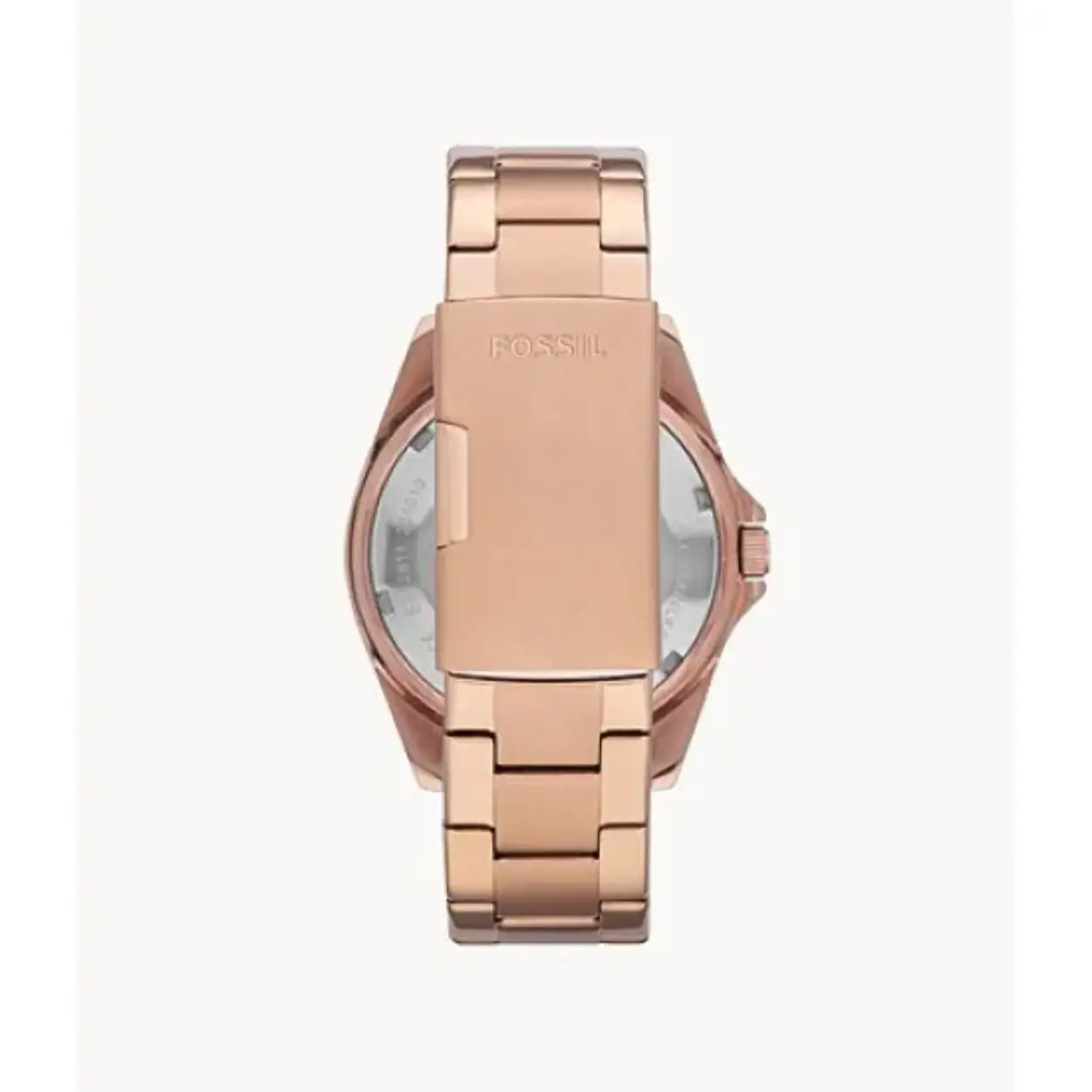 Fossil ES2811 Riley horloge beschikt over een rosé gouden kleur ronde kast met stralende zirkonia's in de lunet. Behalve een tijdsweergave heeft dit horloge ook nog een dag en datum aanduiding. Dit model heeft een quartz uurwerk en sterk mineraal glas, hard horloge glas.