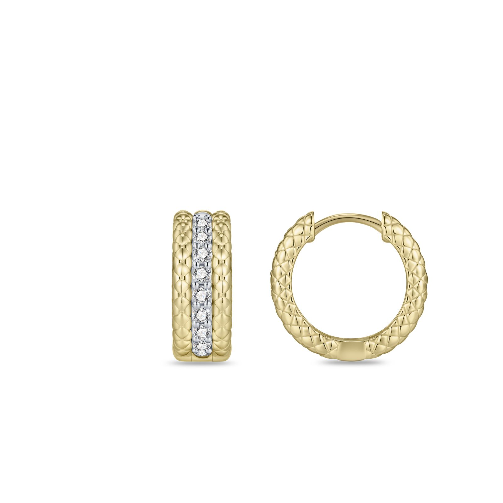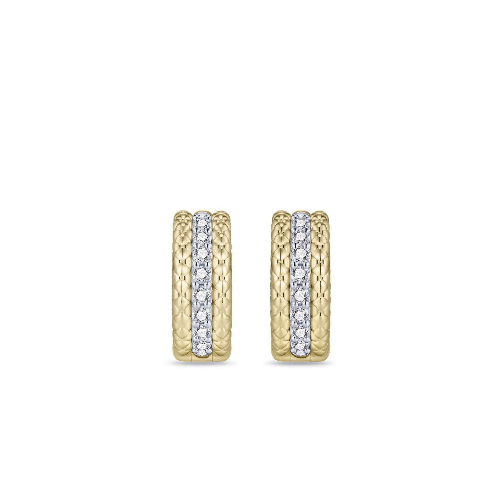 Deze gold plated oorringen van Elena vallen op door de combinatie van structuur en schittering. Het oppervlak heeft een verfijnd patroon dat het ontwerp een bijzondere diepte geeft, terwijl een rij helder stralende zirkonia’s langs de voorzijde voor extra detail zorgt. De oorringen zijn gemaakt van 925 sterling zilver en afgewerkt met een duurzame goudkleurige plating die de warme kleur langdurig behoudt. Met een afmeting van 6,2 mm bij 15 mm sluiten ze stevig en comfortabel aan, ideaal voor dagelijks dragen. De glanzende afwerking maakt deze oorringen een stijlvolle keuze voor uiteenlopende gelegenheden. Dankzij hun uitgebalanceerde ontwerp zijn ze moeiteloos te combineren met andere sieraden uit de Elena-collectie.