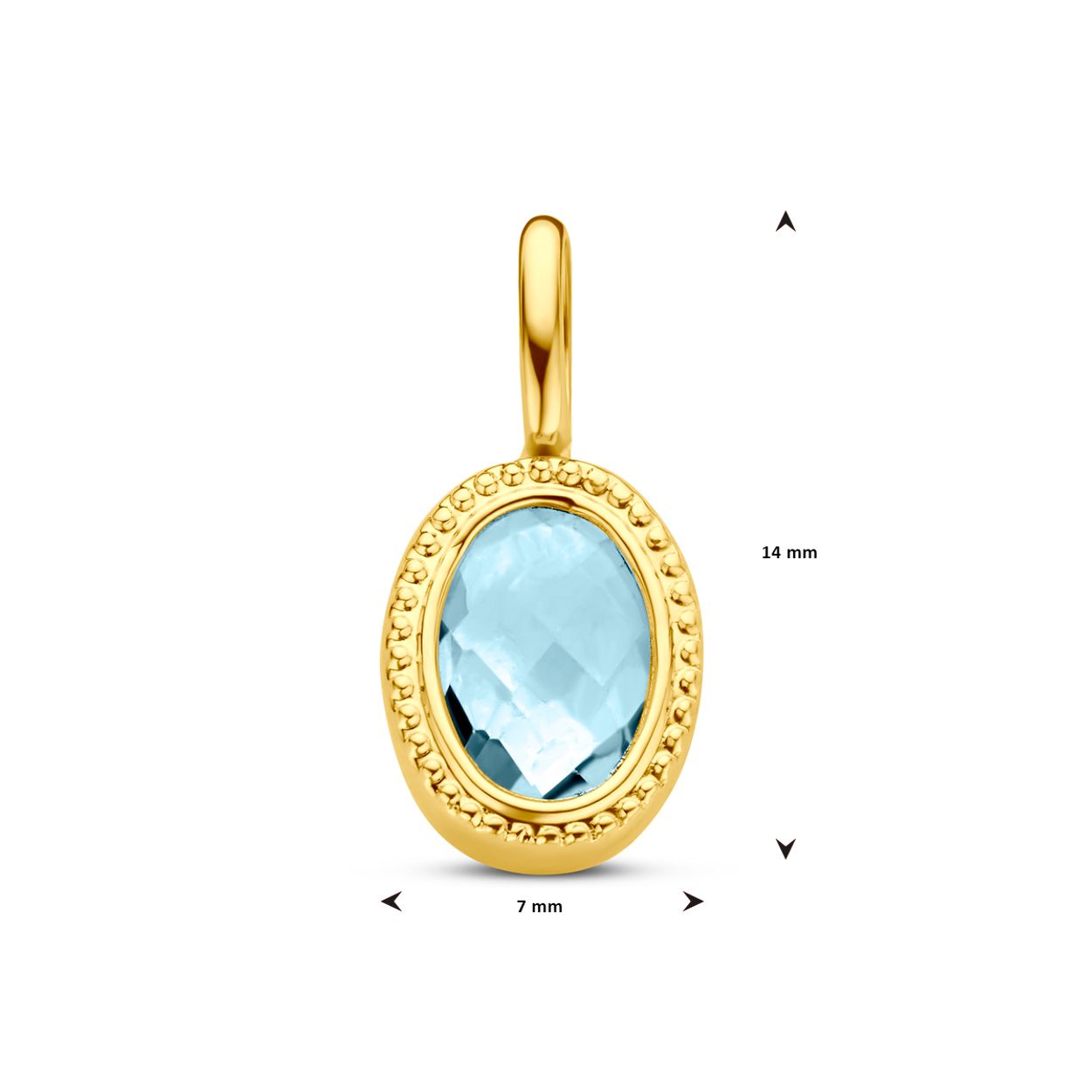 14k Geelgouden hanger uitgevoerd met sky blue topaas. De hanger heeft een afmeting van 14.5x7.5mm.
