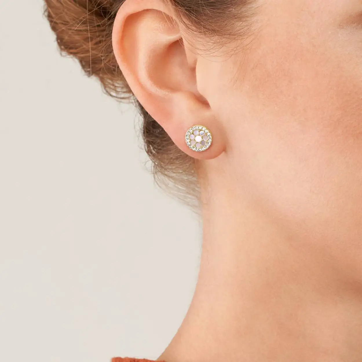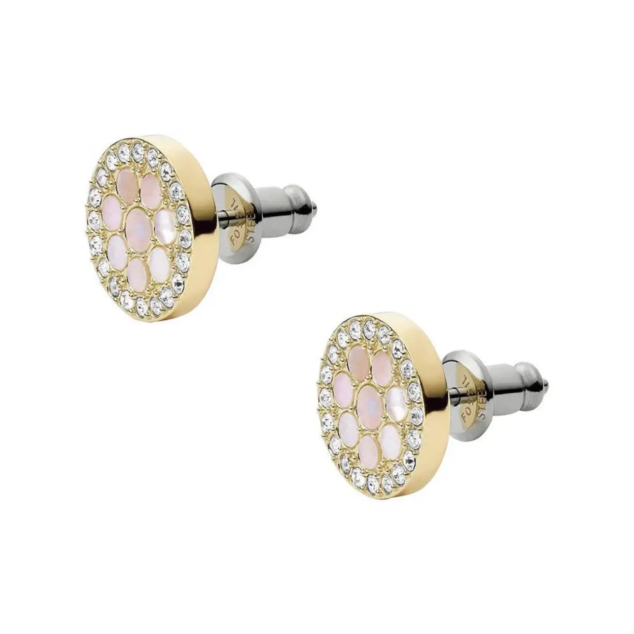 Fossil oorstekers van staal in goudkleurig met zirkonia stenen en in het midden met gekleurde parelmoer.