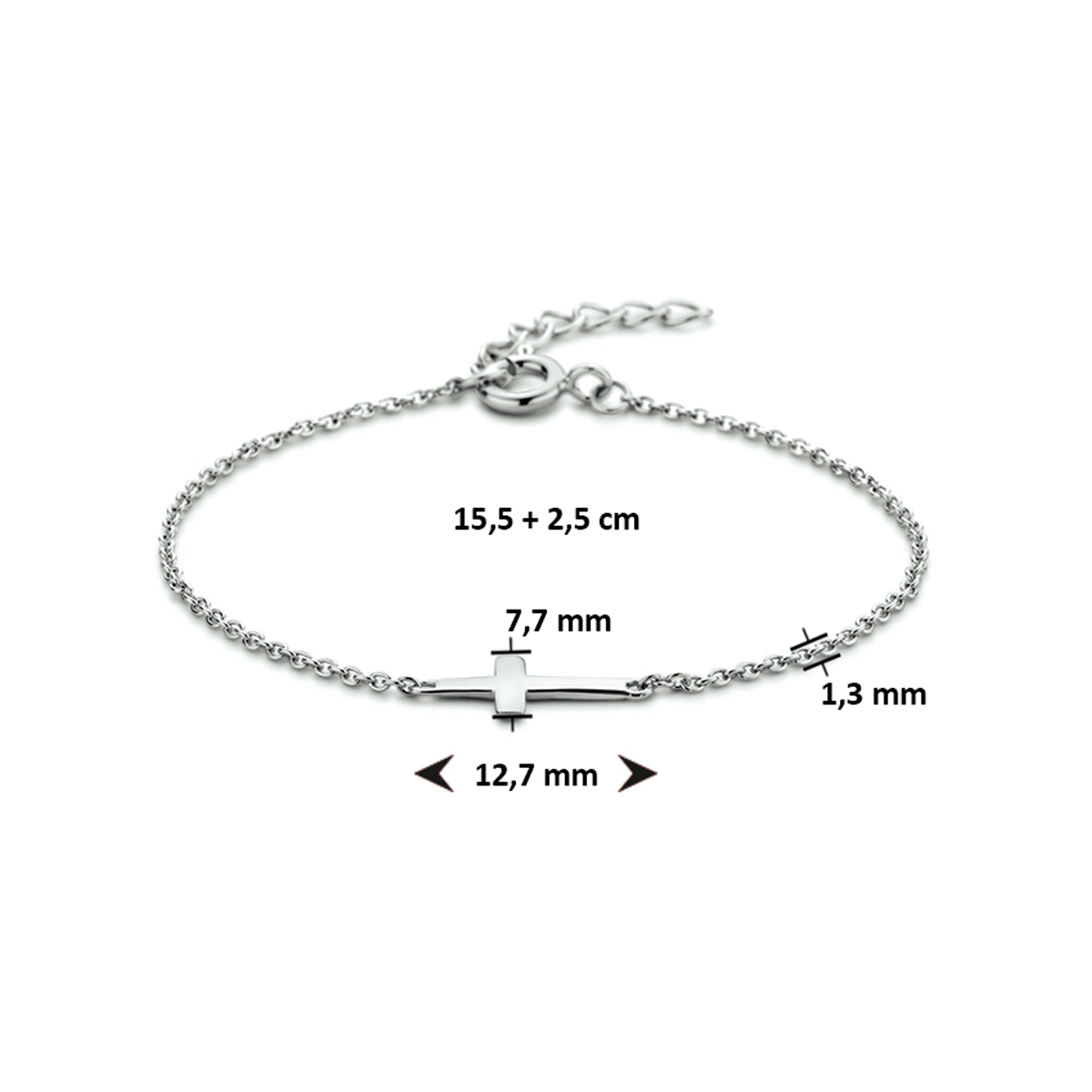 Gerhodineerd 925 zilveren armband uitgevoerd met een kruis. De armband heeft een draaglengte van 15.5cm met een extensie van 2.5cm. Het kruis heeft een afmeting van 7.7x12.7mm. De schakelbreedte is 1.3mm.