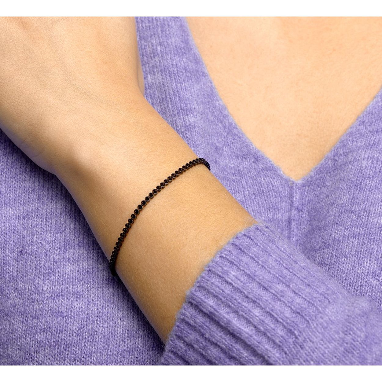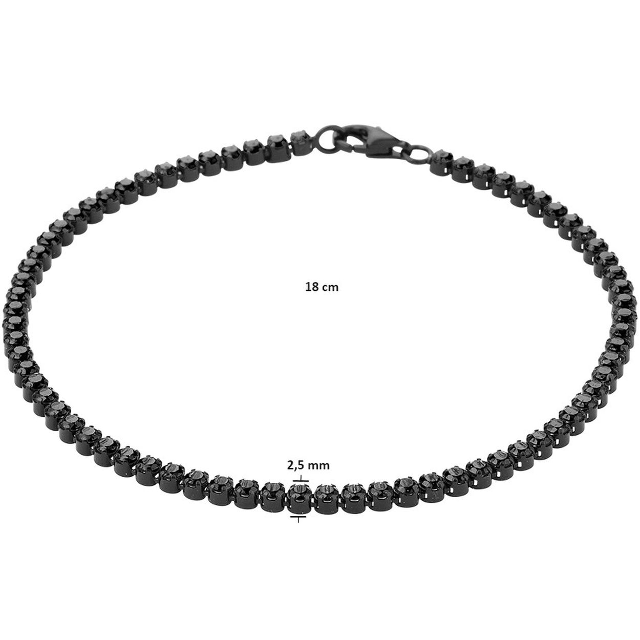 Zwart ruthenium 925 zilveren tennisarmband uitgevoerd met zwart zirkonia en een stevige karabijn sluiting. De armband heeft een draaglengte van 18cm en een breedte van 2.5mm.