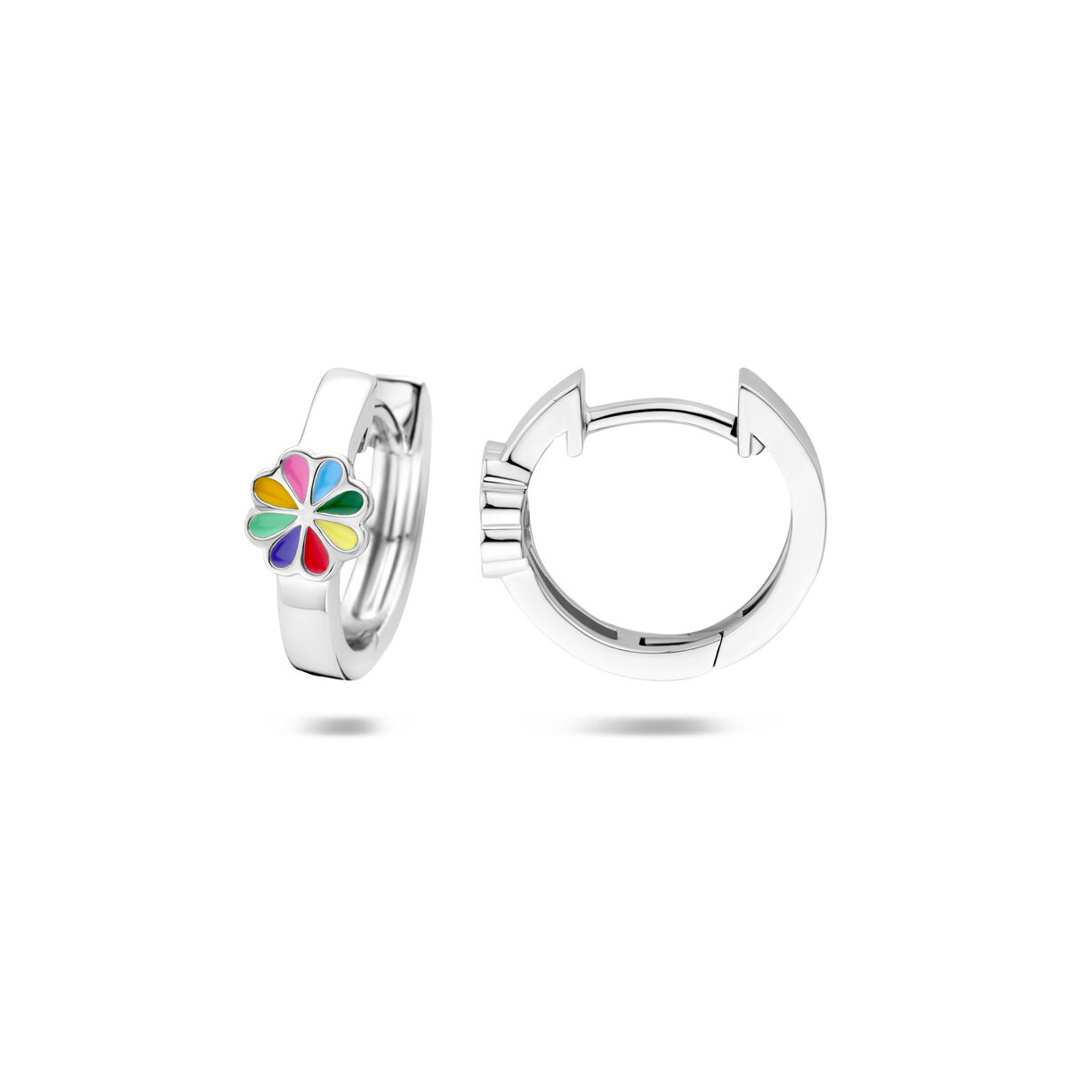Schattige gerhodineerd zilveren oorringen met scharnier uitgevoerd met een bloem in verschillende kleuren emaille. De oorringen hebben een diameter van 12.5mm.