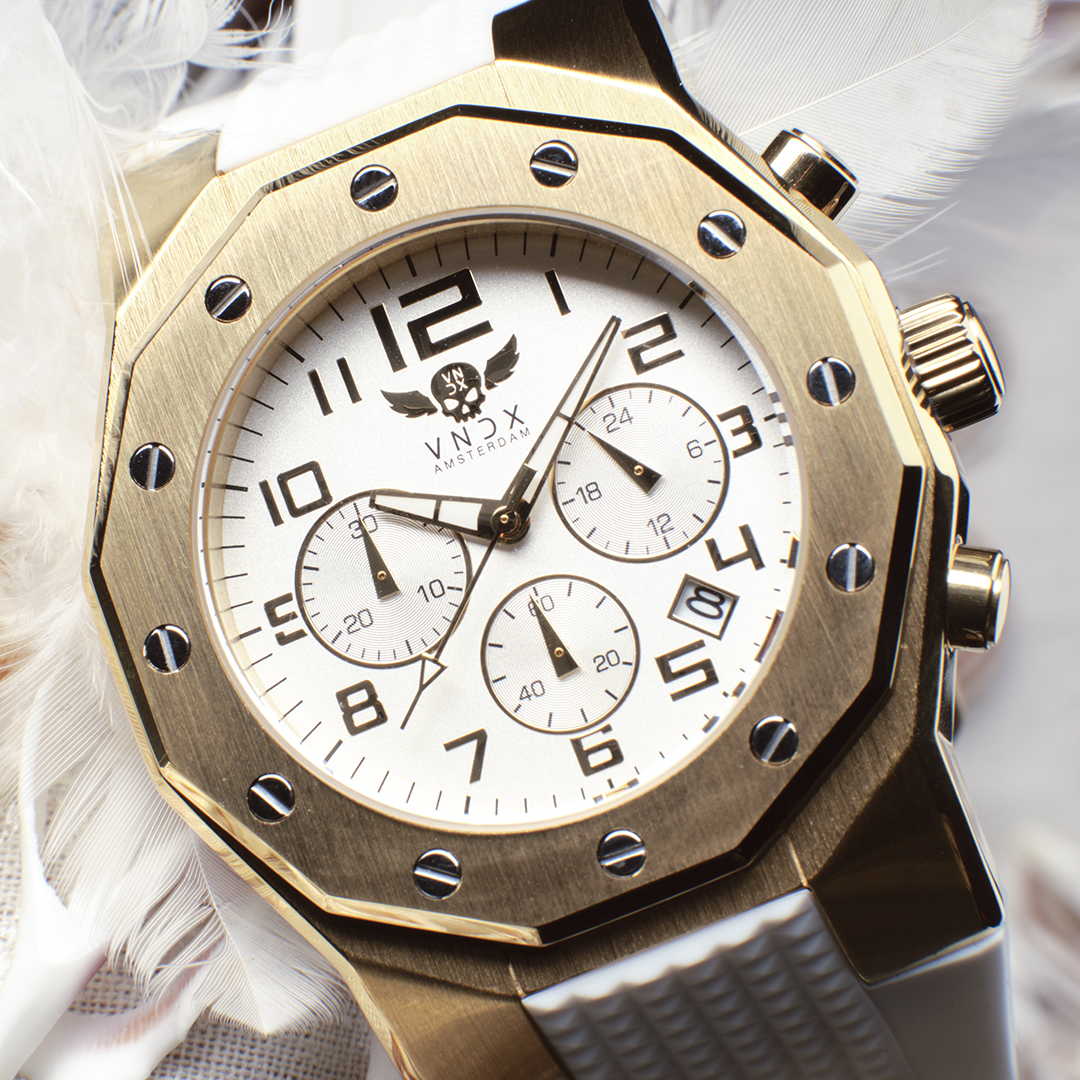 Een stoer horloge voor hem en haar, uitgevoerd met een mat geborstelde goudkleurige stalen kast, gecombineerd met de flexibele en comfortabele witte siliconen band.