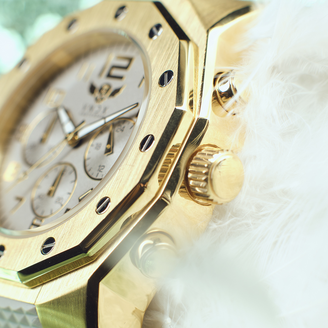Een stoer horloge voor hem en haar, uitgevoerd met een mat geborstelde goudkleurige stalen kast, gecombineerd met de flexibele en comfortabele goud siliconen band.