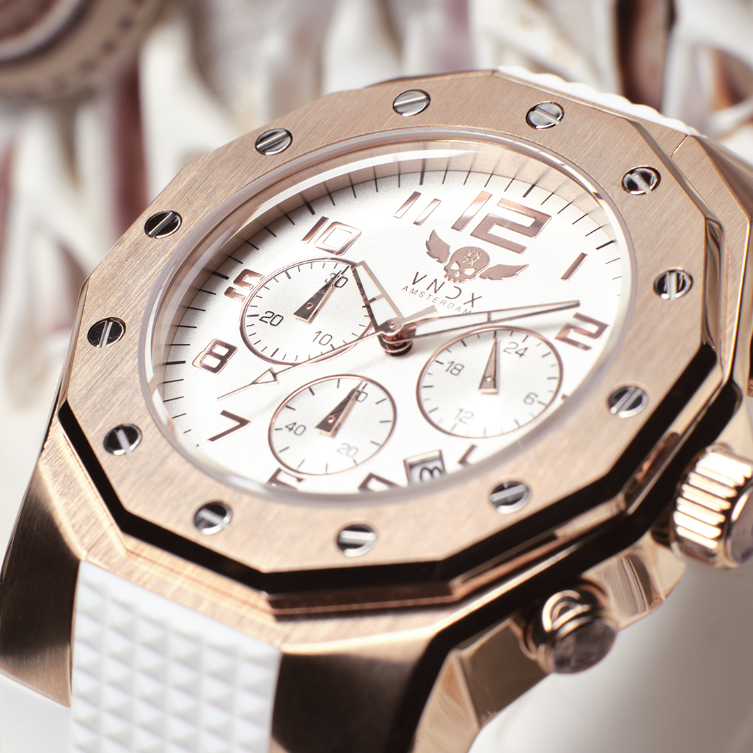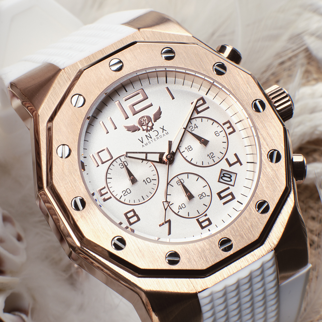 Een stoer horloge voor hem en haar, uitgevoerd met een mat geborstelde rosékleurige stalen kast, gecombineerd met de flexibele en comfortabele witte siliconen band.