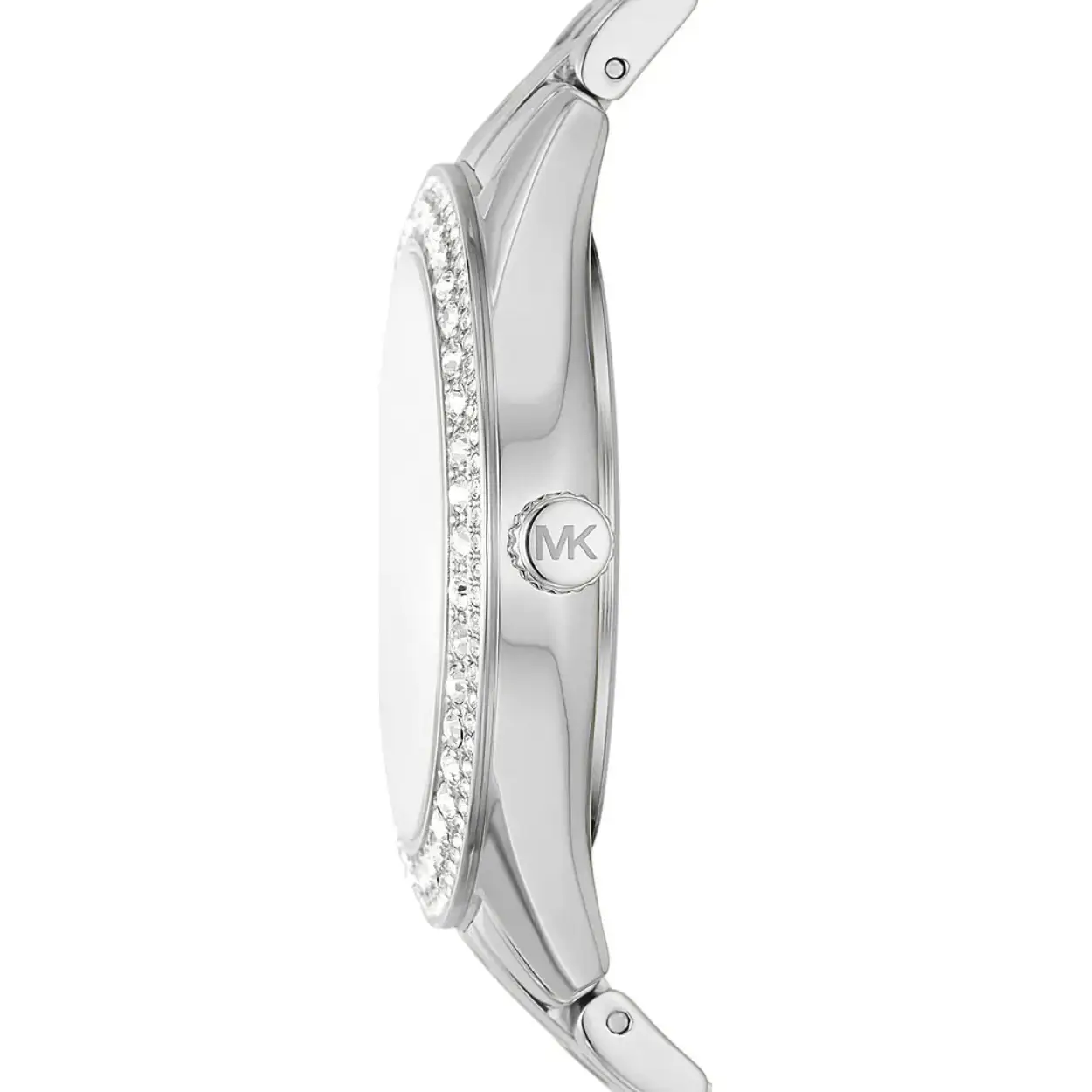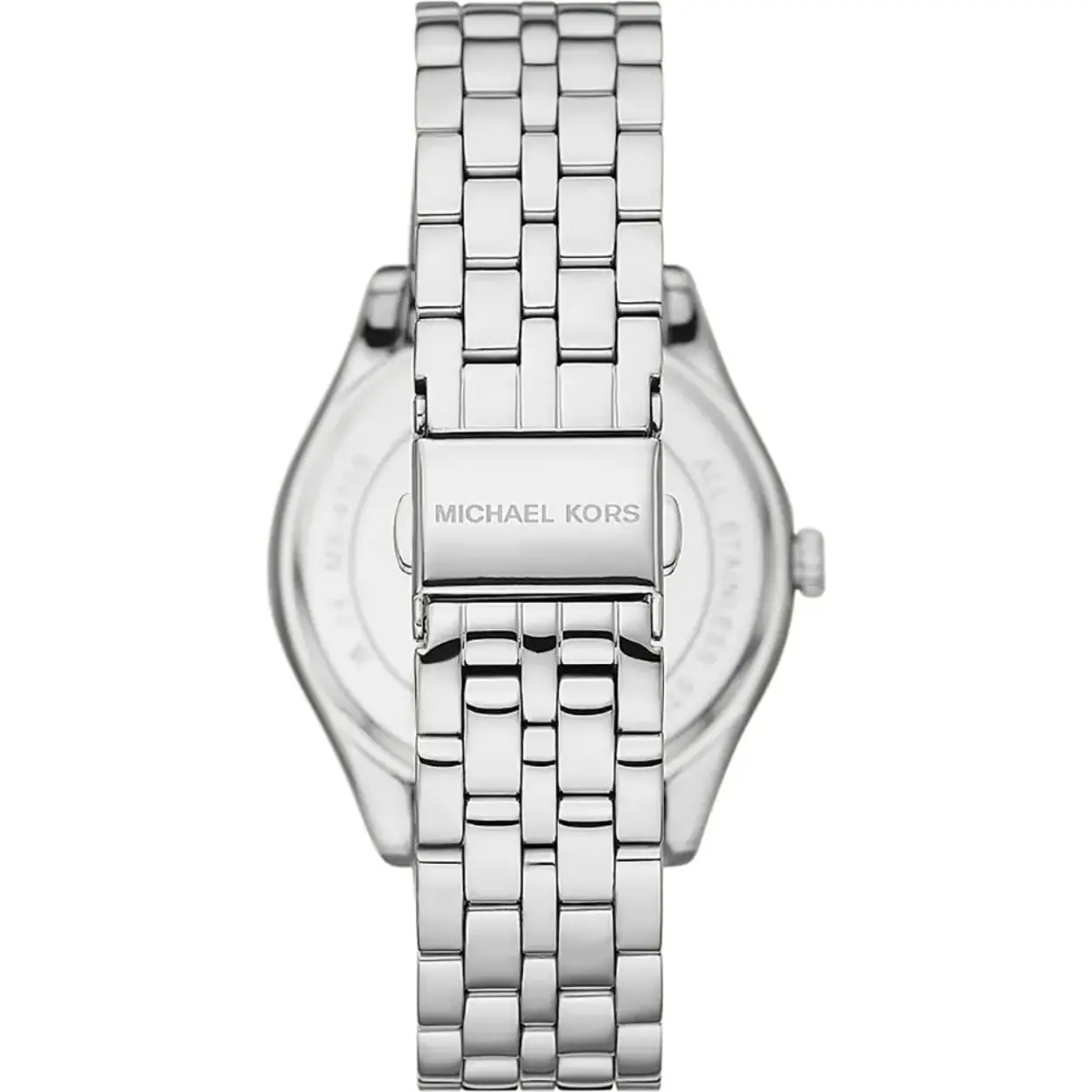 Introductie van Harlowe. Het nieuwe vrouwelijke Michael Kors platform heeft alle details van luxe waar ze dol op zal zijn. Dit roestvrijstalen horloge heeft een wijzerplaat met buitenranden van pavé en klassieke Romeinse cijfers. Het pavé loopt door tot op de bovenring in meerdere rijen met steentjes van verschillende grootte voor een zeer elegante look.