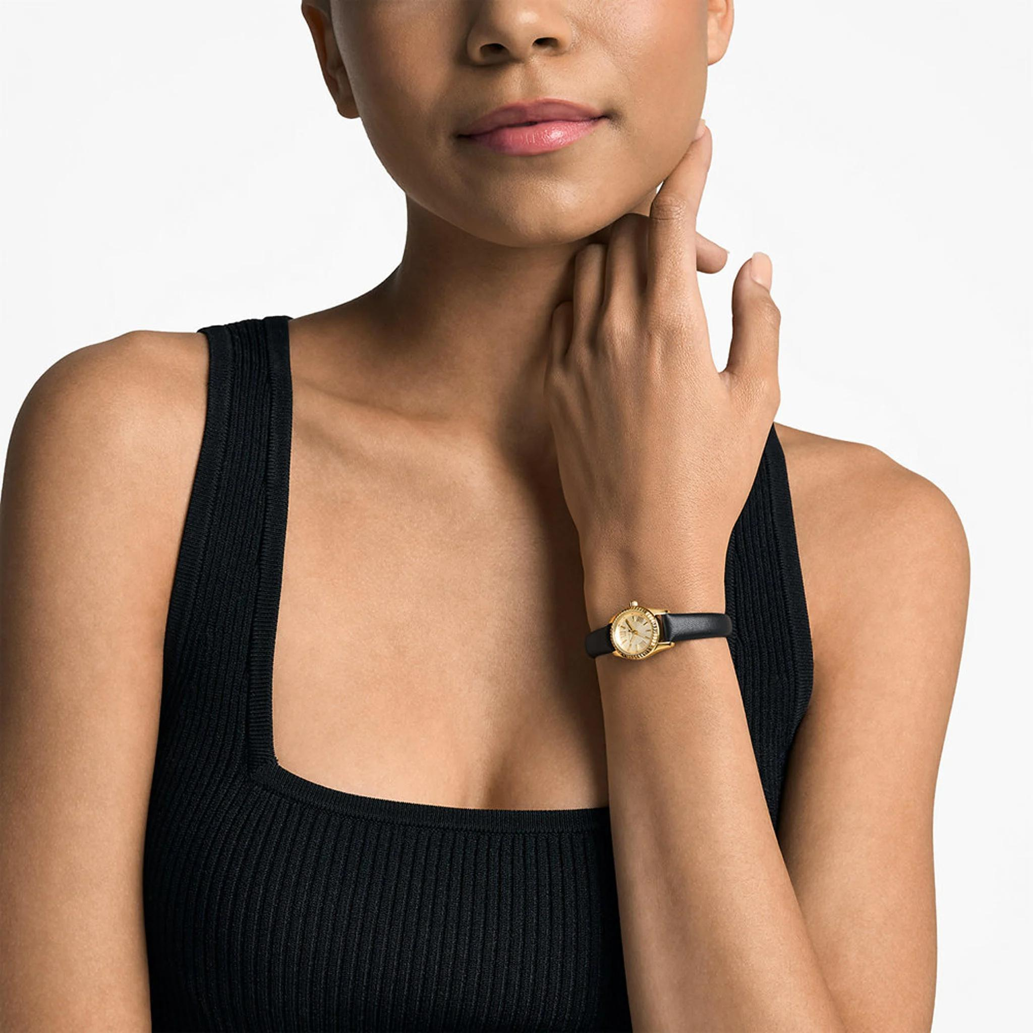 Het Lexington horloge, met een goudkleurigige kast en klassieke Romeinse cijfers, belichaamt glamour voor elke dag. Dit mini uurwerk is uitgevoerd met een ronde wijzerplaat met een afgeschuinde bovenring en een zwart leren bandje. Geef outfits voor overdag en ’s avonds een dosis verfijnde charme met dit horloge.