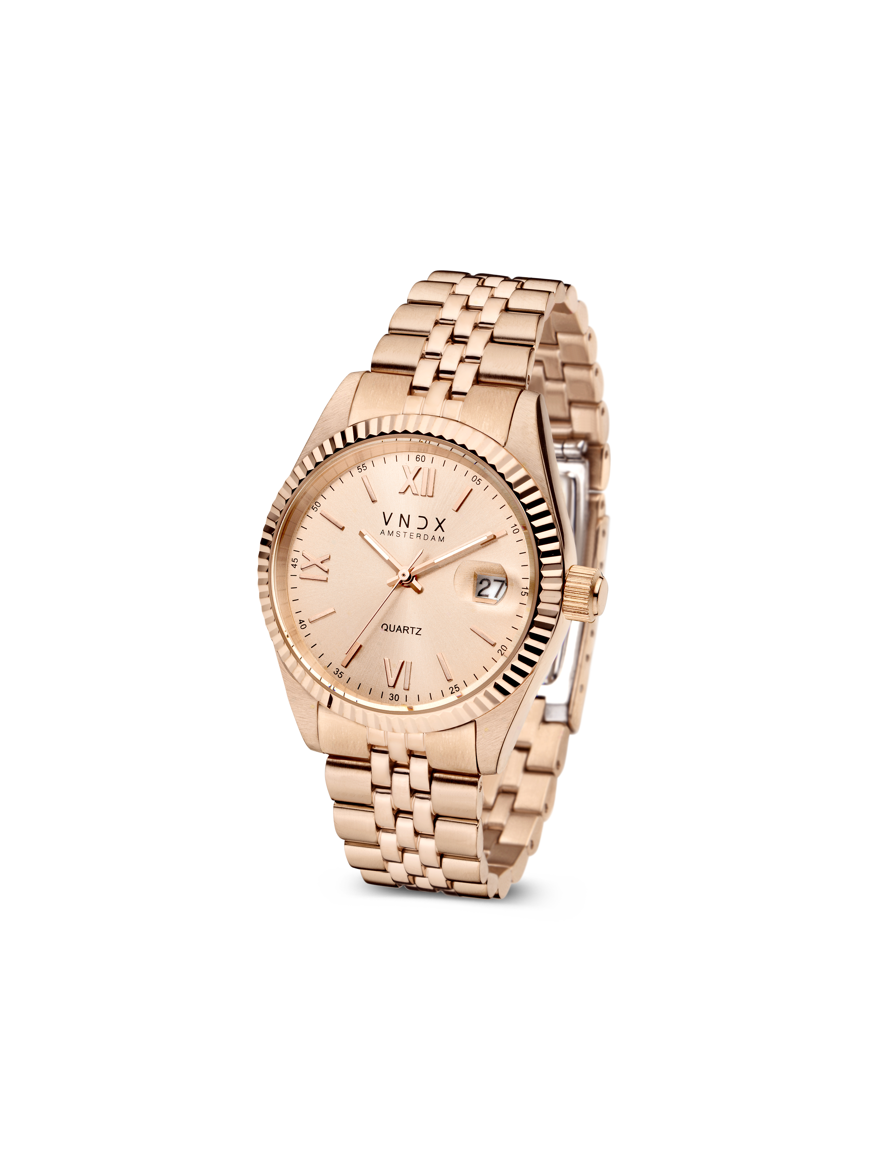 Haar klassieke design zorgt ervoor dat je Dare Devil laat zien waarvoor je staat. Wanneer je haar van dichterbij ontdekt, zie je de prachtige rosé wijzerplaat, voorzien van een iets donkere rosé-gouden index met datumaanduiding. Zo ben jij nooit te laat voor je feestje, afspraak of deadline.