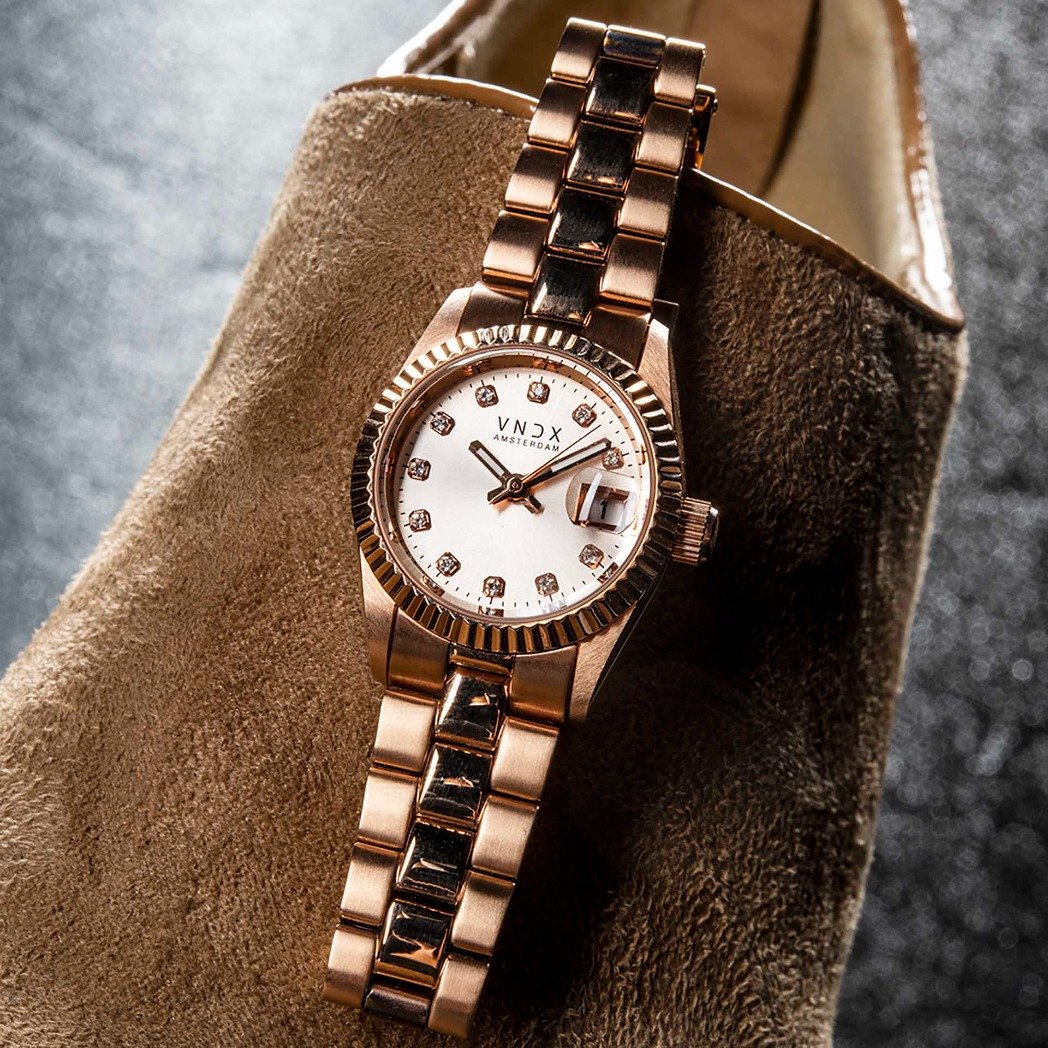 De Dare Devil XS Rosé, het meest gedetailleerde horloge van VNDX Amsterdam. Haar subtiele kast van 26 mm maakt haar een perfect accessoire om te combineren met je favoriete sieraden. Haar elegante rosé-gouden schakelband zorgt ervoor dat je Dare Devil eenvoudig op maat te maken is.